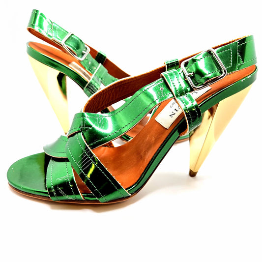 Lanvin Ete 2009 emerald green patent leather slingback sandals gold metallic cone heels size 38.5