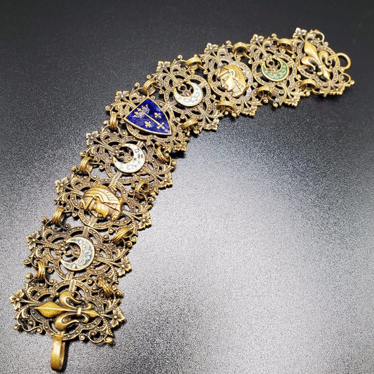 Vintage ART DECO Egyptian Revival Filigree Enamel, Moon, Fleur De Lis Brass Bracelet