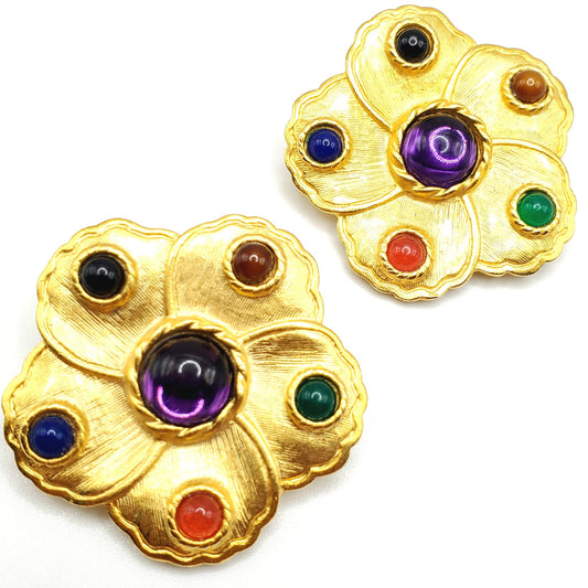 vintage large flower flory multicolor cabochon gold tone clip on earrings