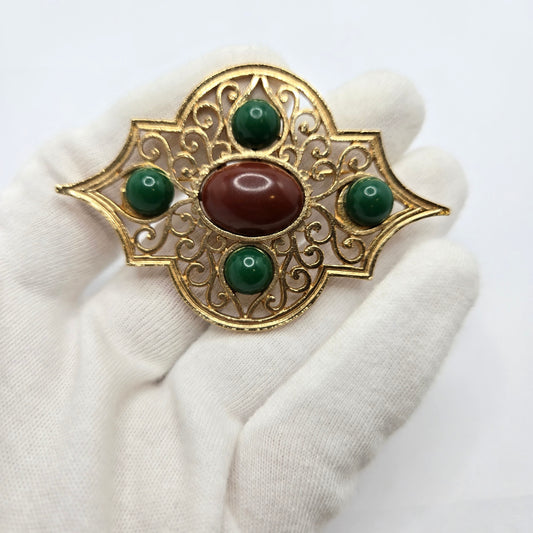 Vintage CORO Open work Red green Cabochon gold tone designer runway Brooch pin