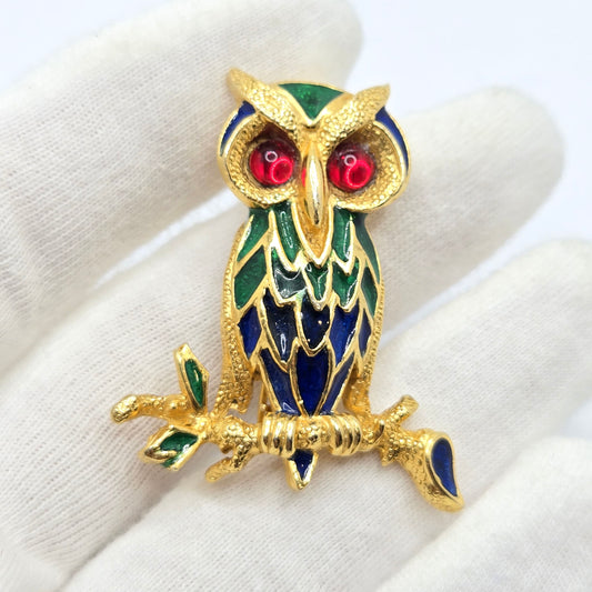 Vintage POLCINI Owl green blue enamel red Cabochon Eyes Brooch Pin