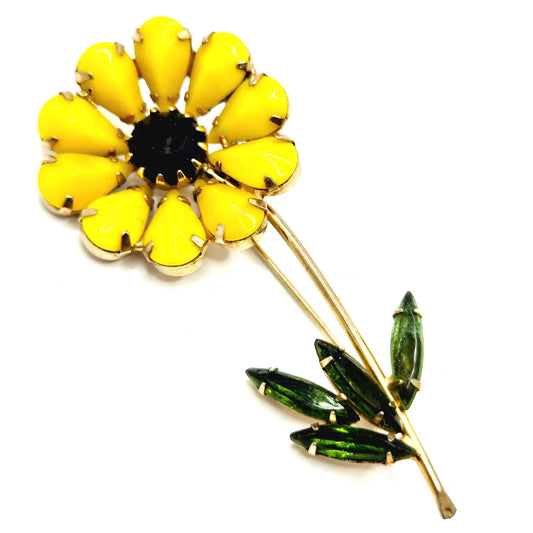 Vintage WEISS unsigned Yellow Flower Green Black Rhinestones Gold tone Brooch Pin