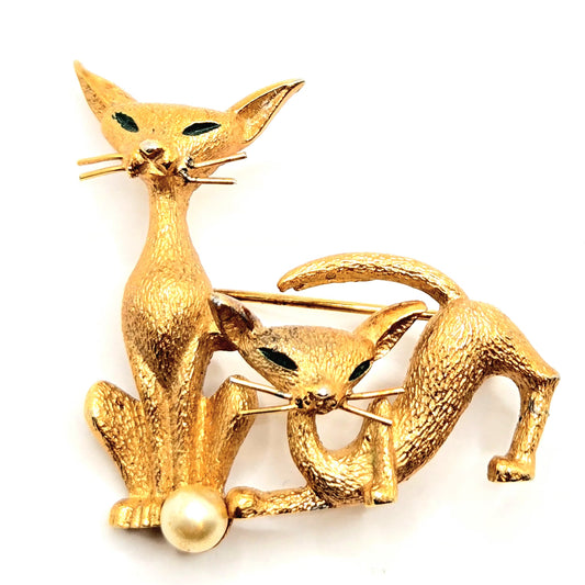 Vintage MARCEL BOUCHER Siamese Cats Gold Tone Green Enamel Eyes Brooch Pin