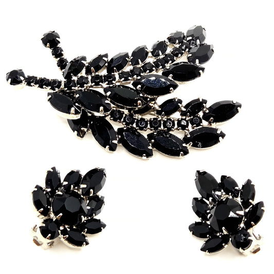 Vintage WEISS Black Navettes Rhinestones Silver tone Brooch Pin and Clip on Earrings set