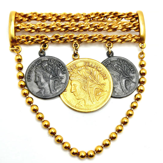 Vintage Republique Francaise Faux Coins Dangle Gold Tone Chain Brooch Pin Designer Runway
