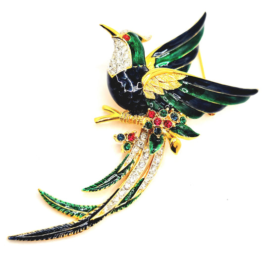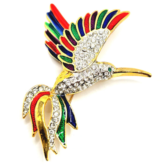 Vintage Beautiful HUMMINGBIRD Red Blue Green Purple Enameled Rhinestones Gold tone Brooch Pin