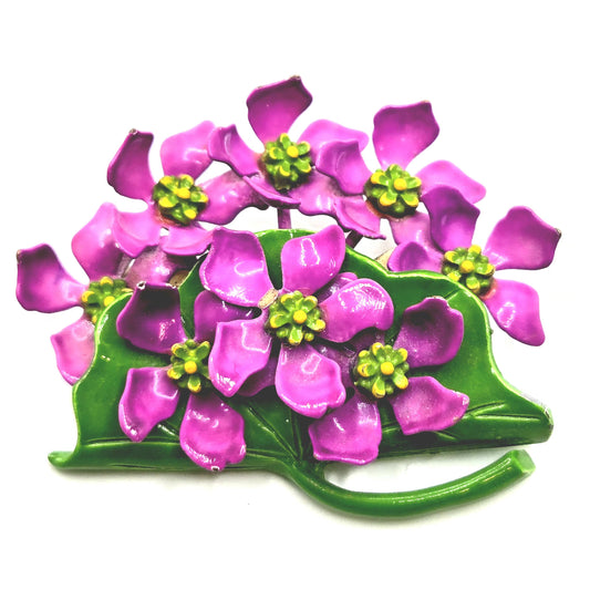 Vintage Beautiful PINK FLOWERS ON THE GREEN LEAF Enameled Brooch pin
