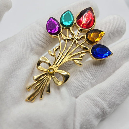 Vintage Flower Bouquet multicolor rhinestones gold tone brooch pin