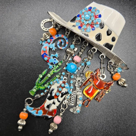 Vintage LUNCH at the RITZ LATR2GO Western Cowgirl hat dangle charms silver tone Brooch Pin/Pendant