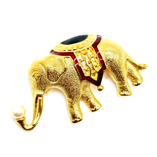 Vintage MONET Signed 1990’s Elephant, Navy Blue, Red Enamel, Faux Pearl, Gold Tone Classic Statement Brooch Pin