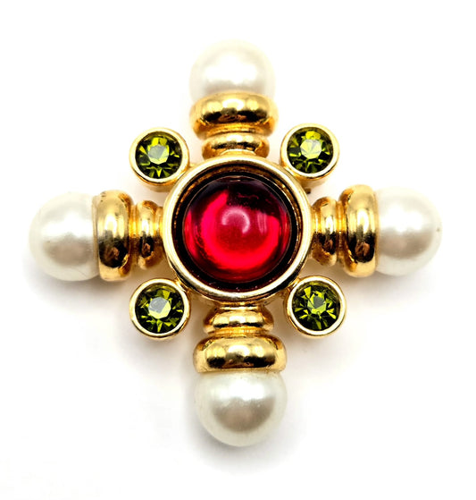 Vintage AVON Gripoix Maltese Cross, Green Rhinestones, Faux Pearls, Red Cabochon, Gold Tone Brooch Pin