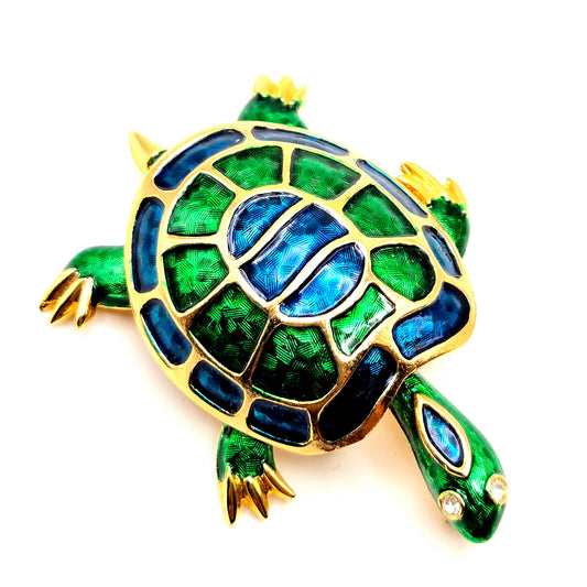 Vintage MARCEL BOUCHER Turtle, Blue and Green Enamel, Rhinestones, Gold Tone Brooch