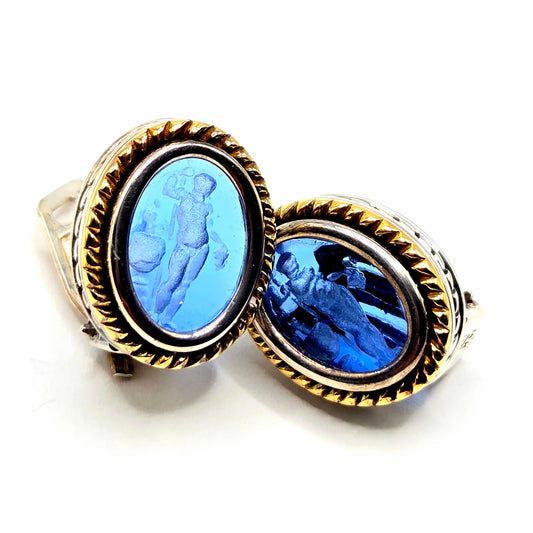 Vintage Italian FLLI MENEGATTI 925 Sterling Silver, 18K Yellow Gold Blue Hand Carved Venetian Glass Intaglio EARRINGS