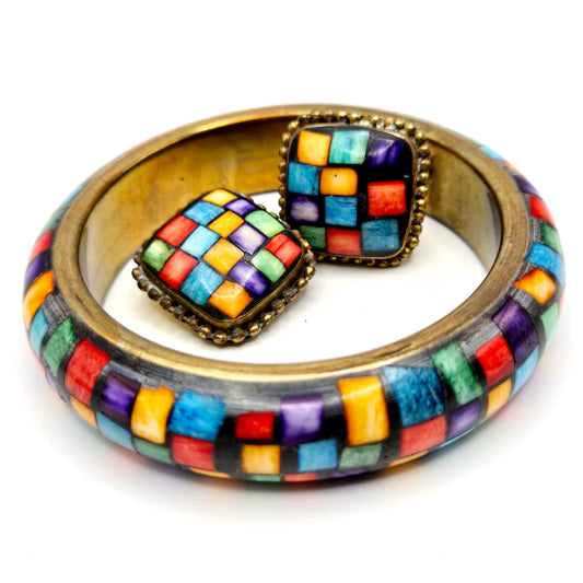 Vintage Multicolored Shell Mosaic, Black, Brass, Chunky Bangle Bracelet and Clip on Earrings Set