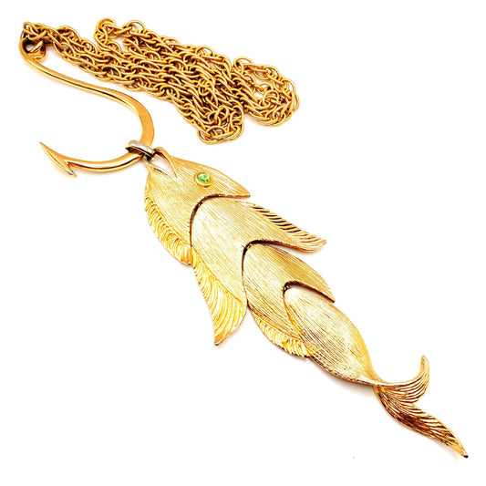 Vintage NAPIER 1970s Gold Tone Runway Articulated Fish On A Hook Pendant Necklace