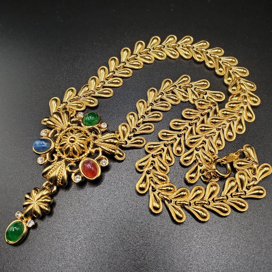 Vintage, Red, Blue, Green Cabochon, Gold Tone Moghul Necklace