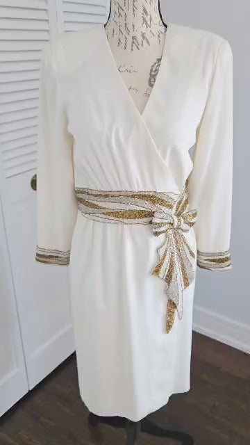 Vintage Bob Mackie off White Cocktail Party Dress Beaded Sequin Dress Long Sleeve Wedding Party Dress Small Cher Dress size 0-2