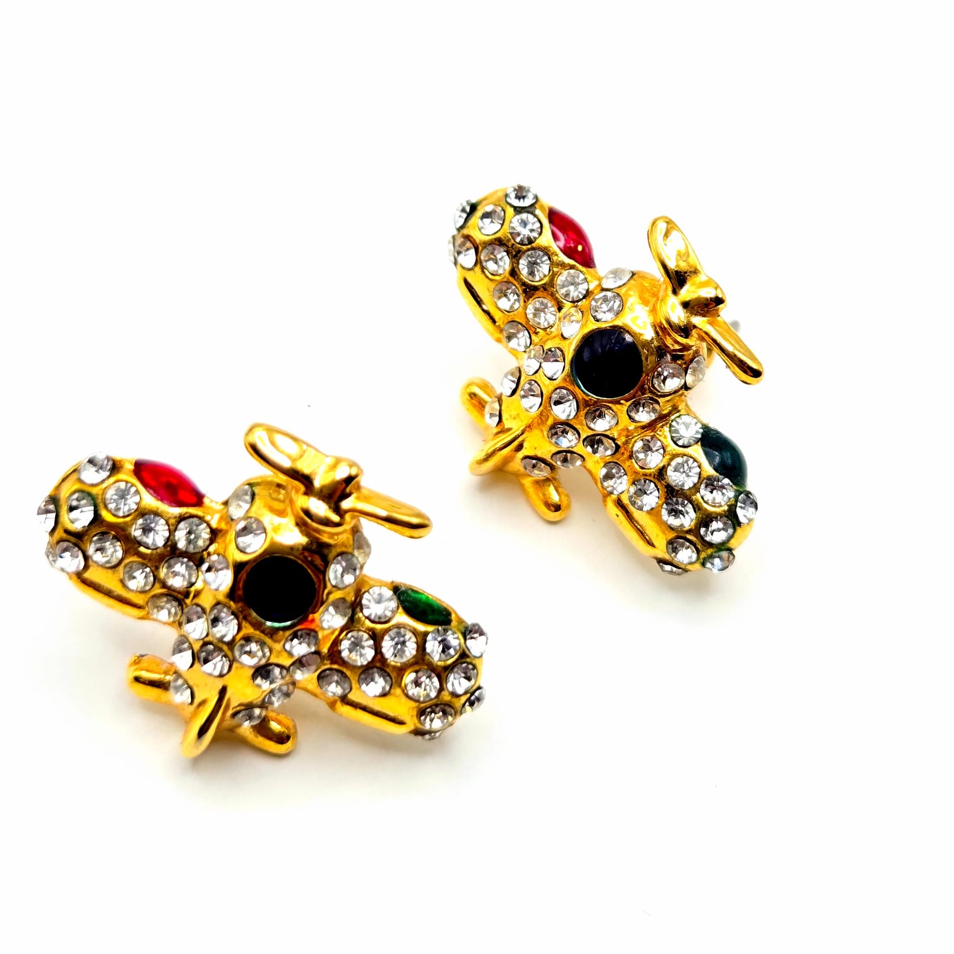 Vintage Airplane Pierced Earrings with Rhinestones, Green, Red, Blue Enamel, Gold Tone