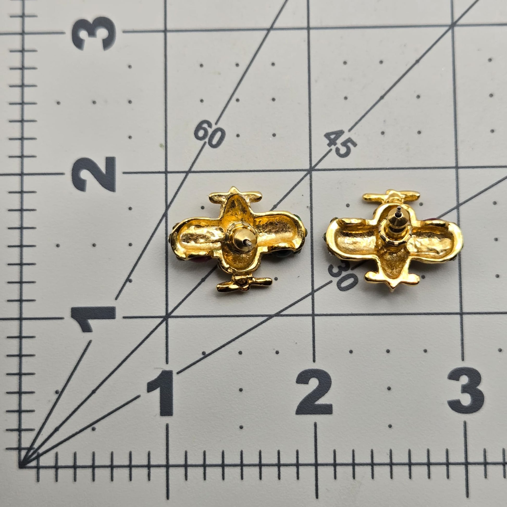 Vintage Airplane Pierced Earrings with Rhinestones, Green, Red, Blue Enamel, Gold Tone Metal