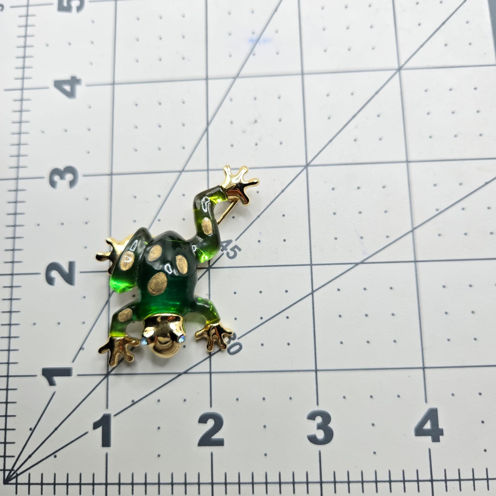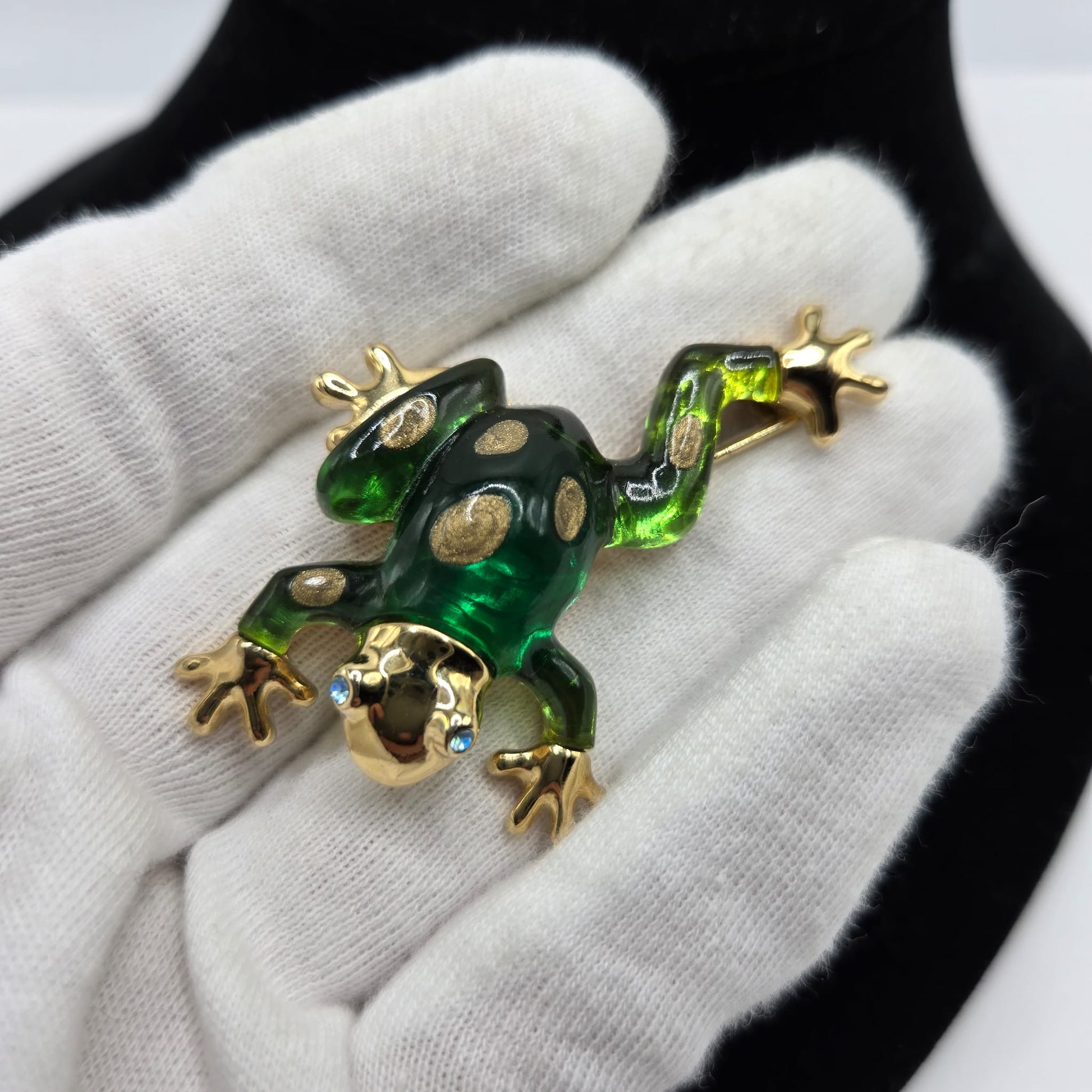 Vintage ANNE KLEIN Frog green lucite gold tone blue eyes rhinestones brooch pin