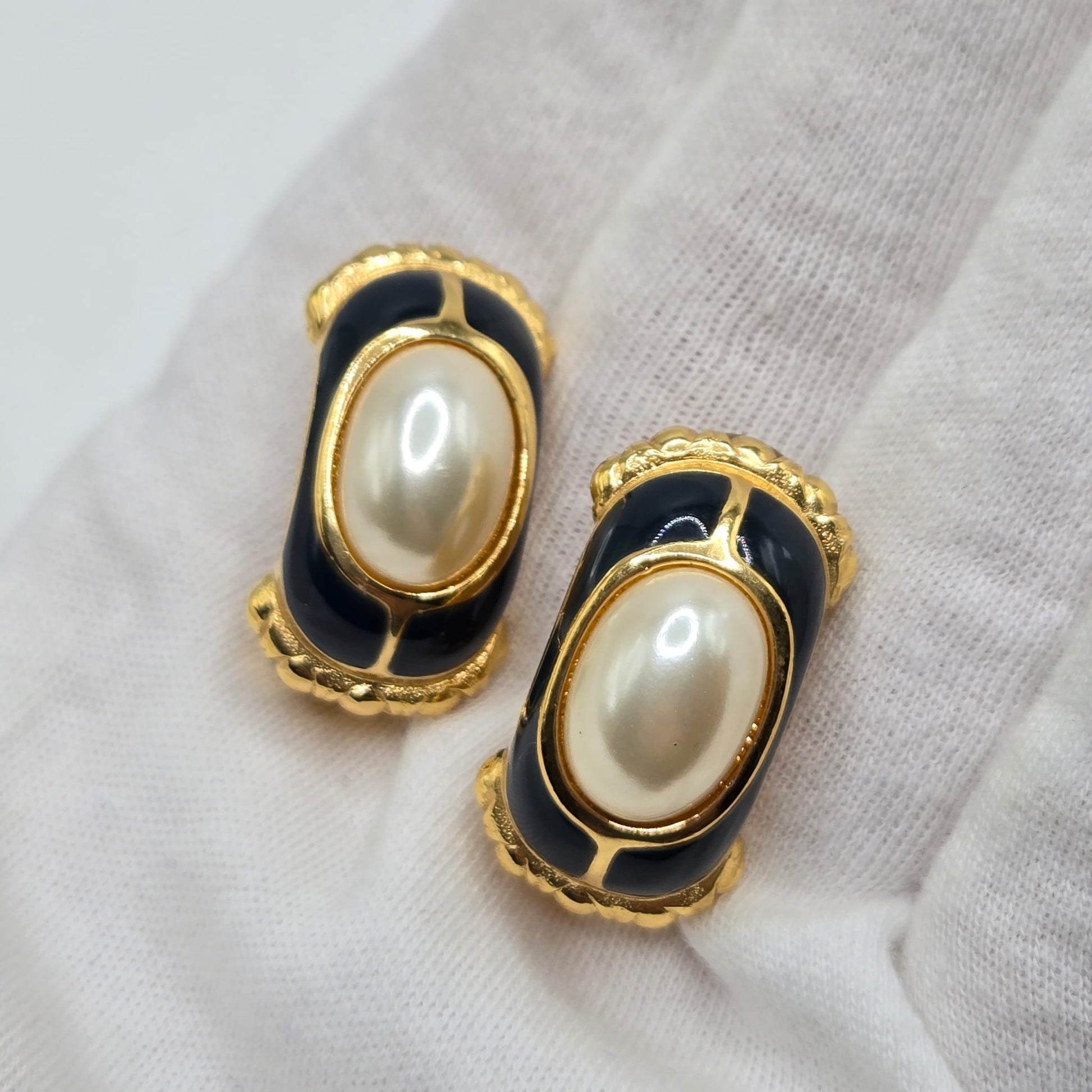 Vintage BURBERRY Navy Blue Enamel Clip Earrings with Faux Pearl, gold tone