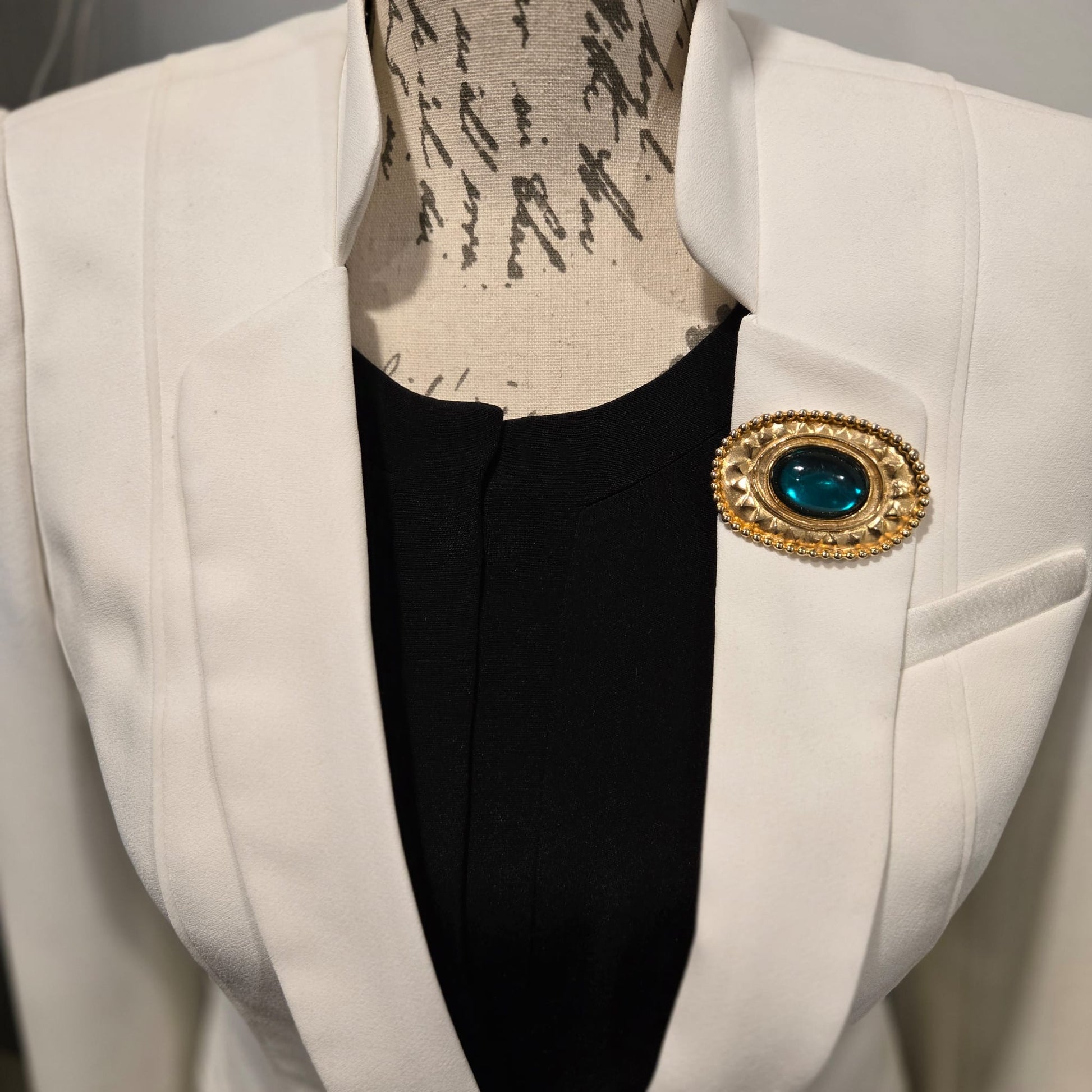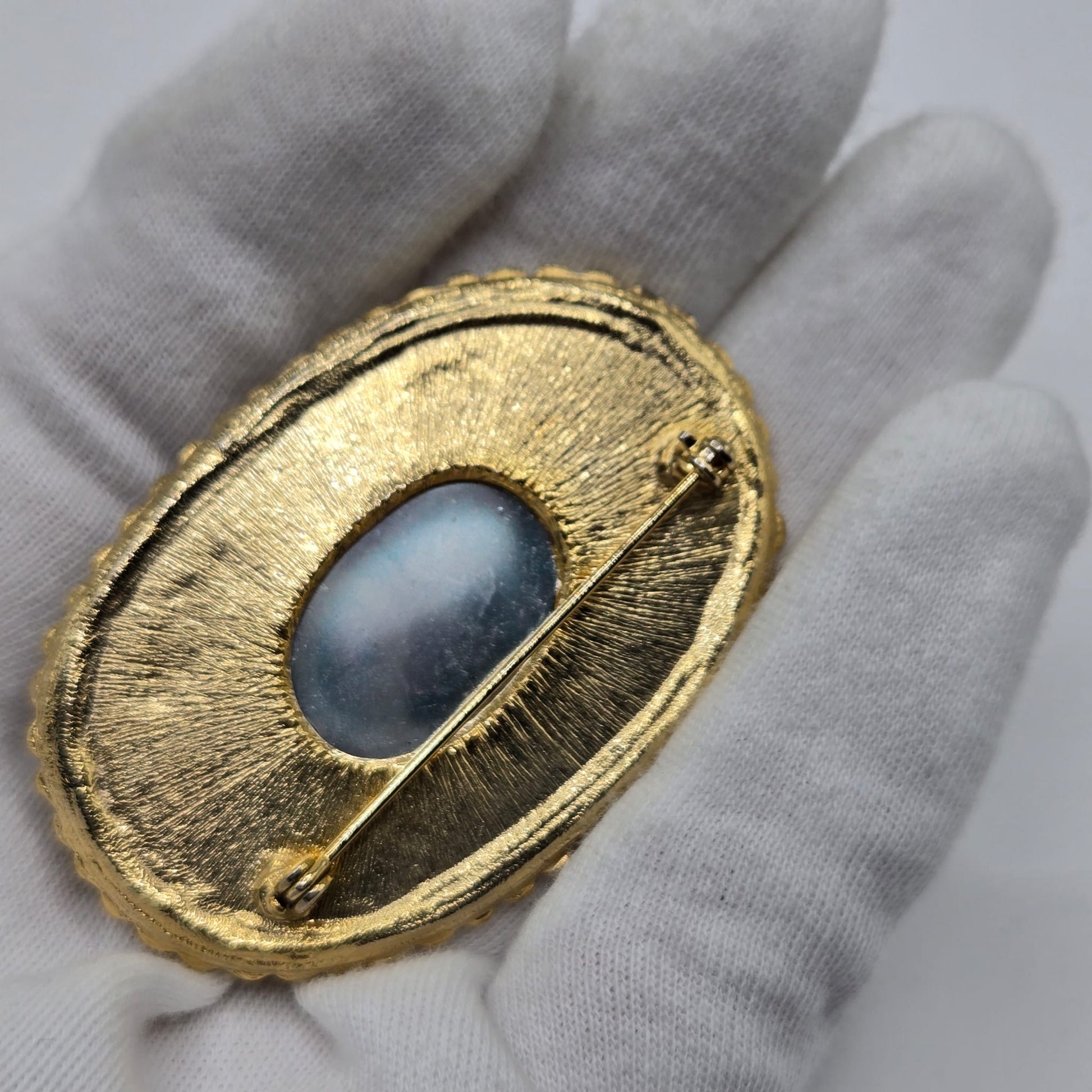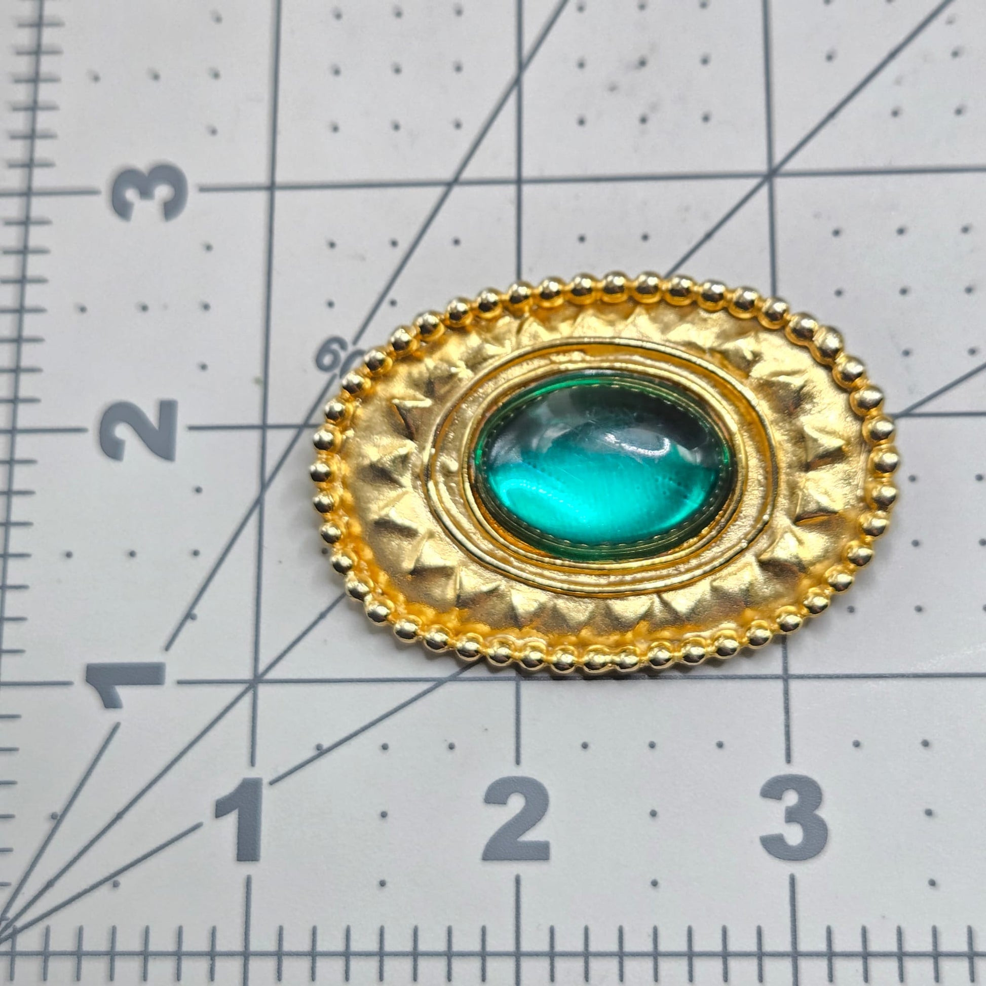 Beautiful Vintage Etruscan designer runway large green Cabochon gold tone brooch pin