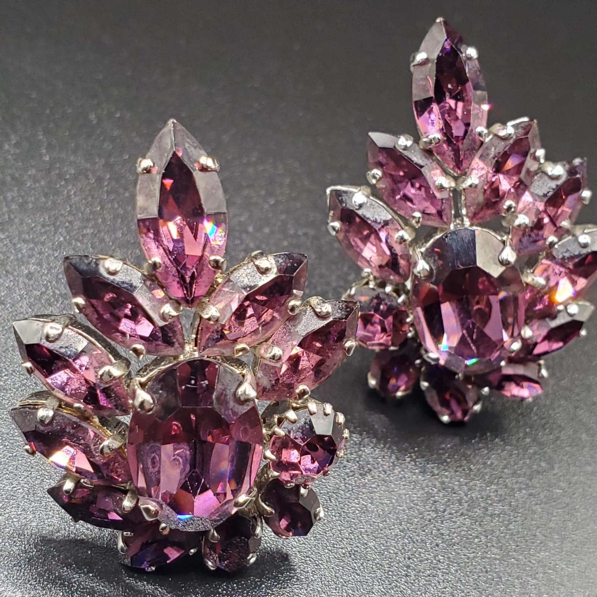 Beautiful Vintage GERMANY Signed VICTORIAN REVIVAL BOHEMIAN Amethyst Rhinestones Large Cluster Clip On Earrings Elegant Statement Piece