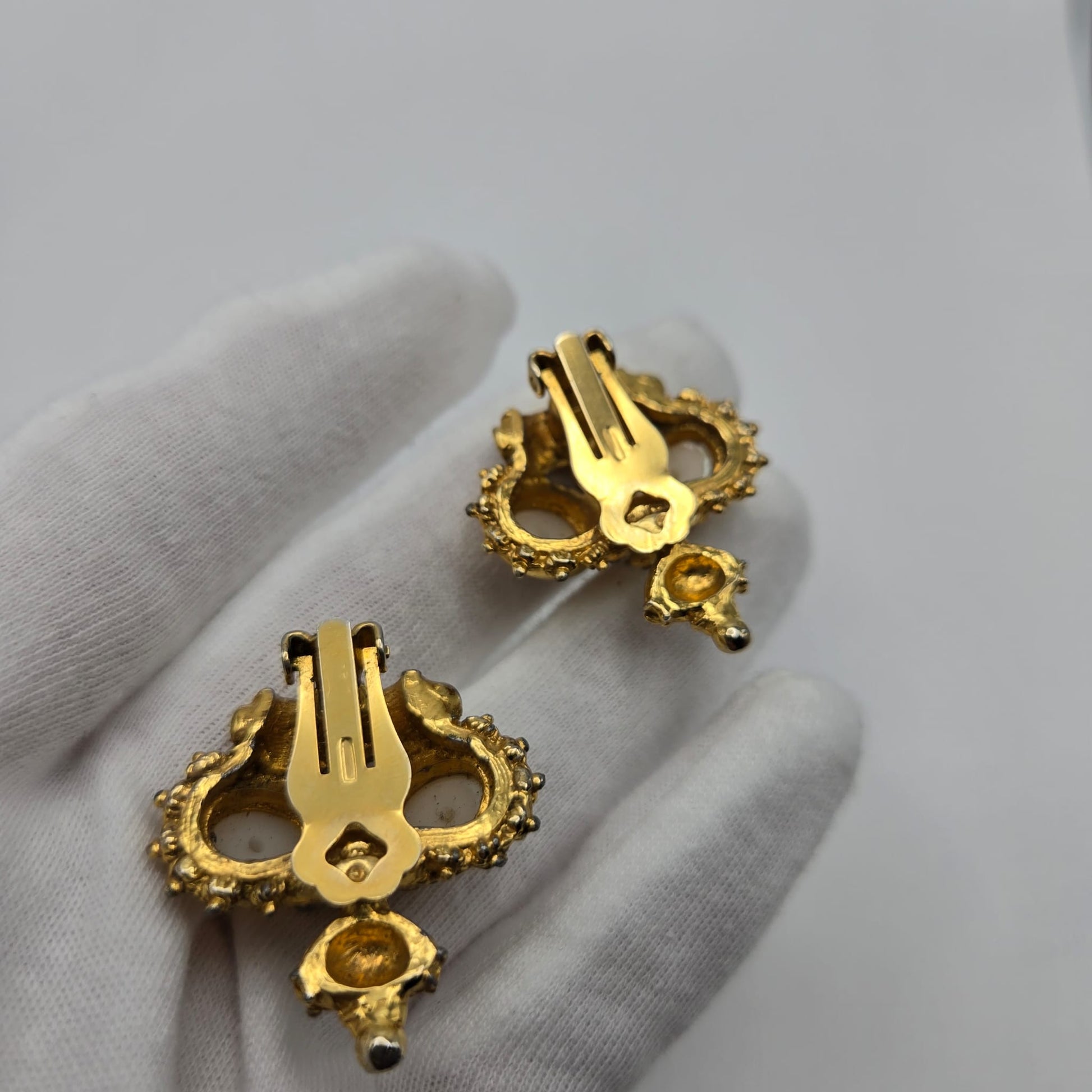 Beautiful Vintage GRAZIANO Crown Clip on Earrings, Faux Pearls, Rhinestones, Gold Tone Metal