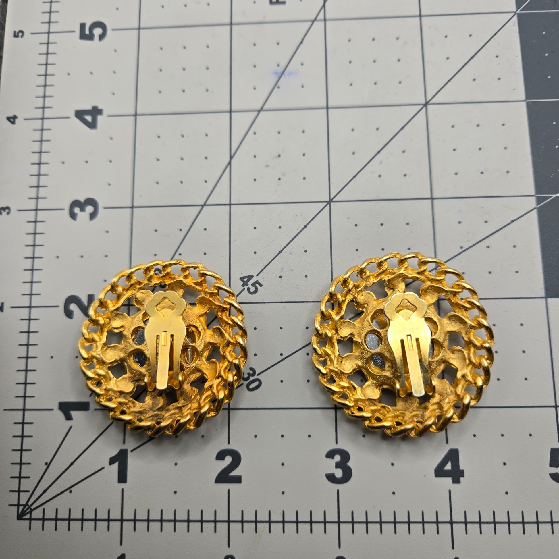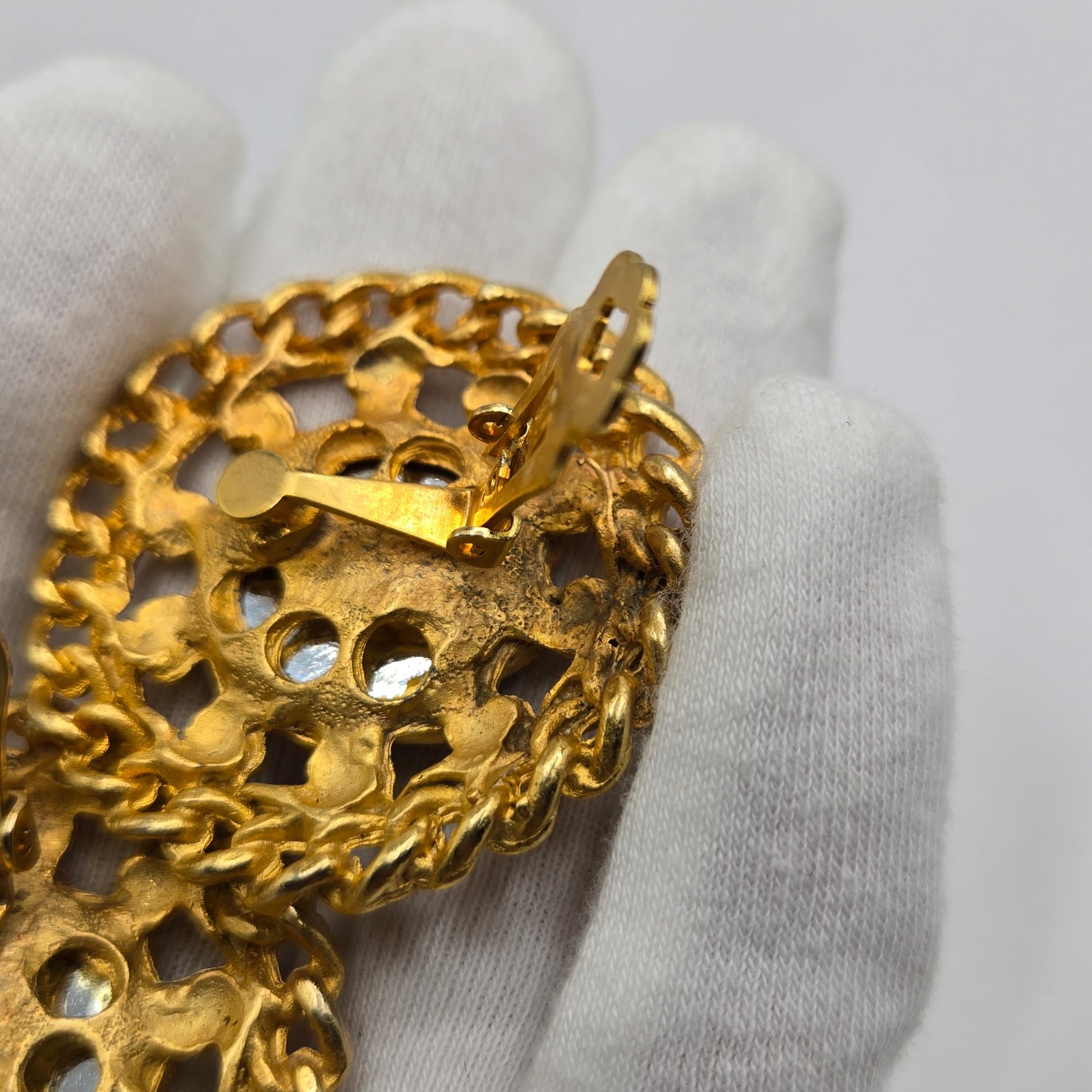 Vintage Huge Designer Runway Round Faux Blue sapphire Cabochon Chain Gold tone clip on earrings