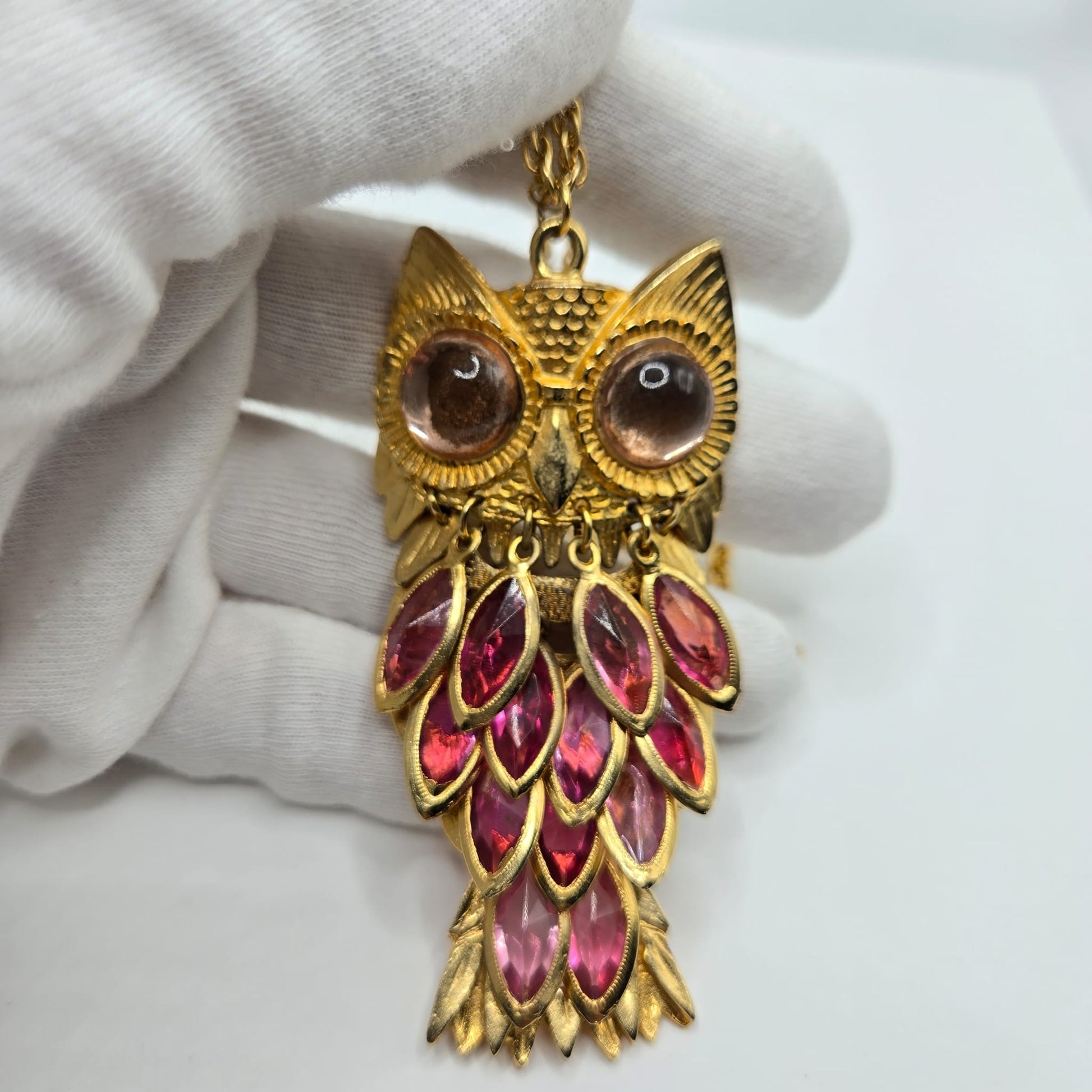 Vintage Huge Owl Pink Bazel Crystals jelly belly eyes gold tone necklace