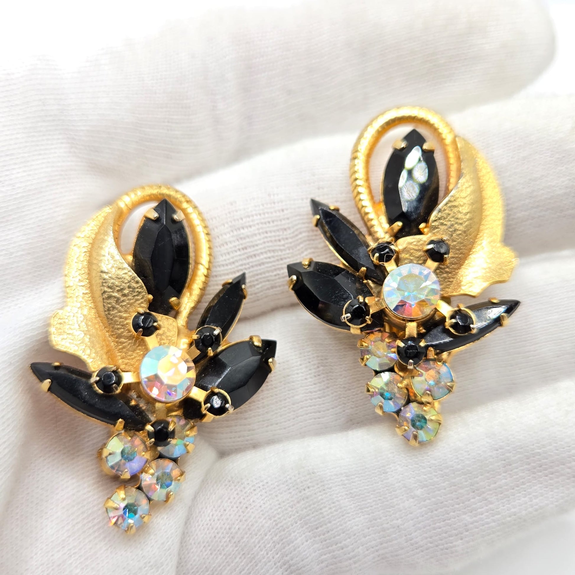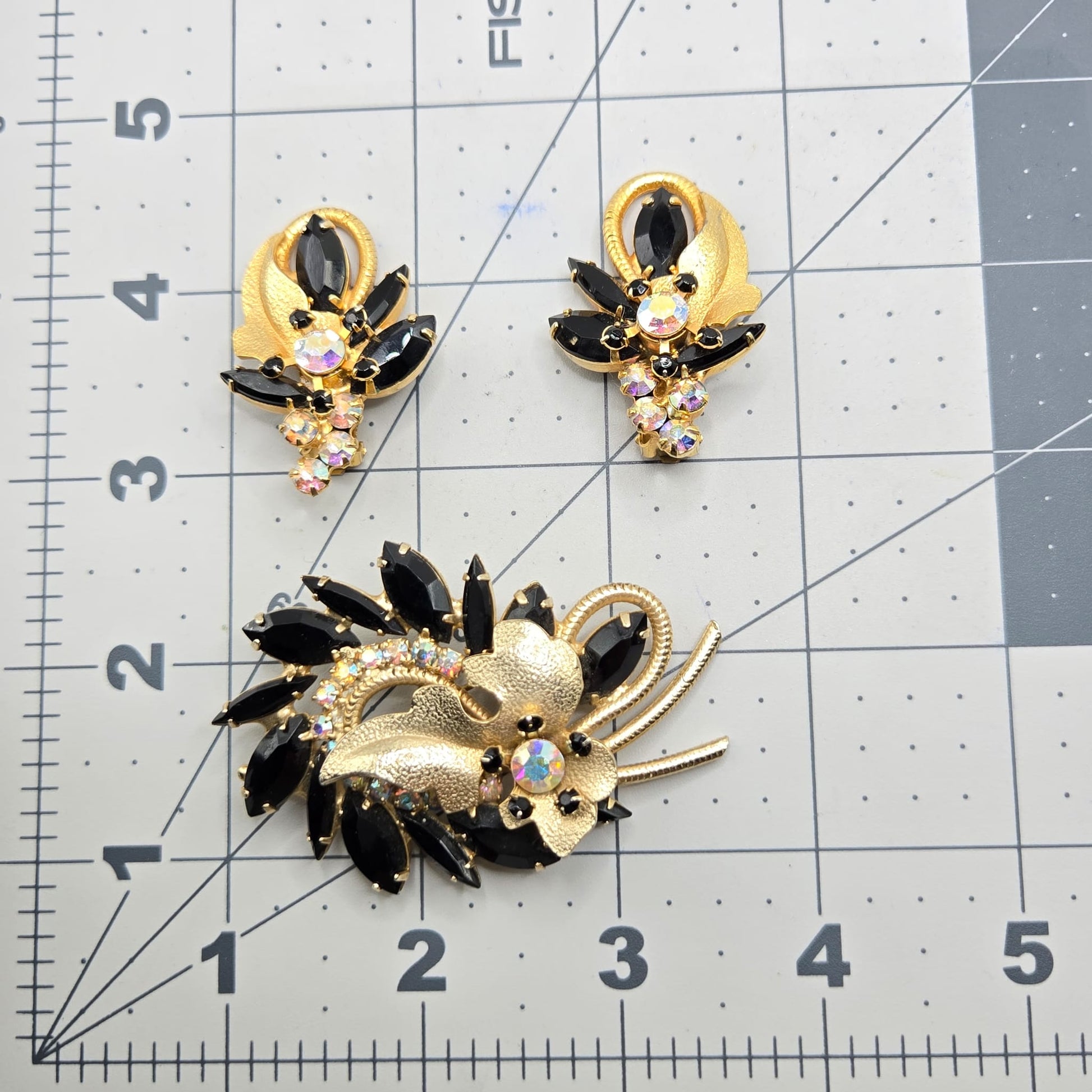 Vintage Juliana D & E Leaves Black Navettes and AB Rhinestones gold tone Brooch pin and clip on earrings set