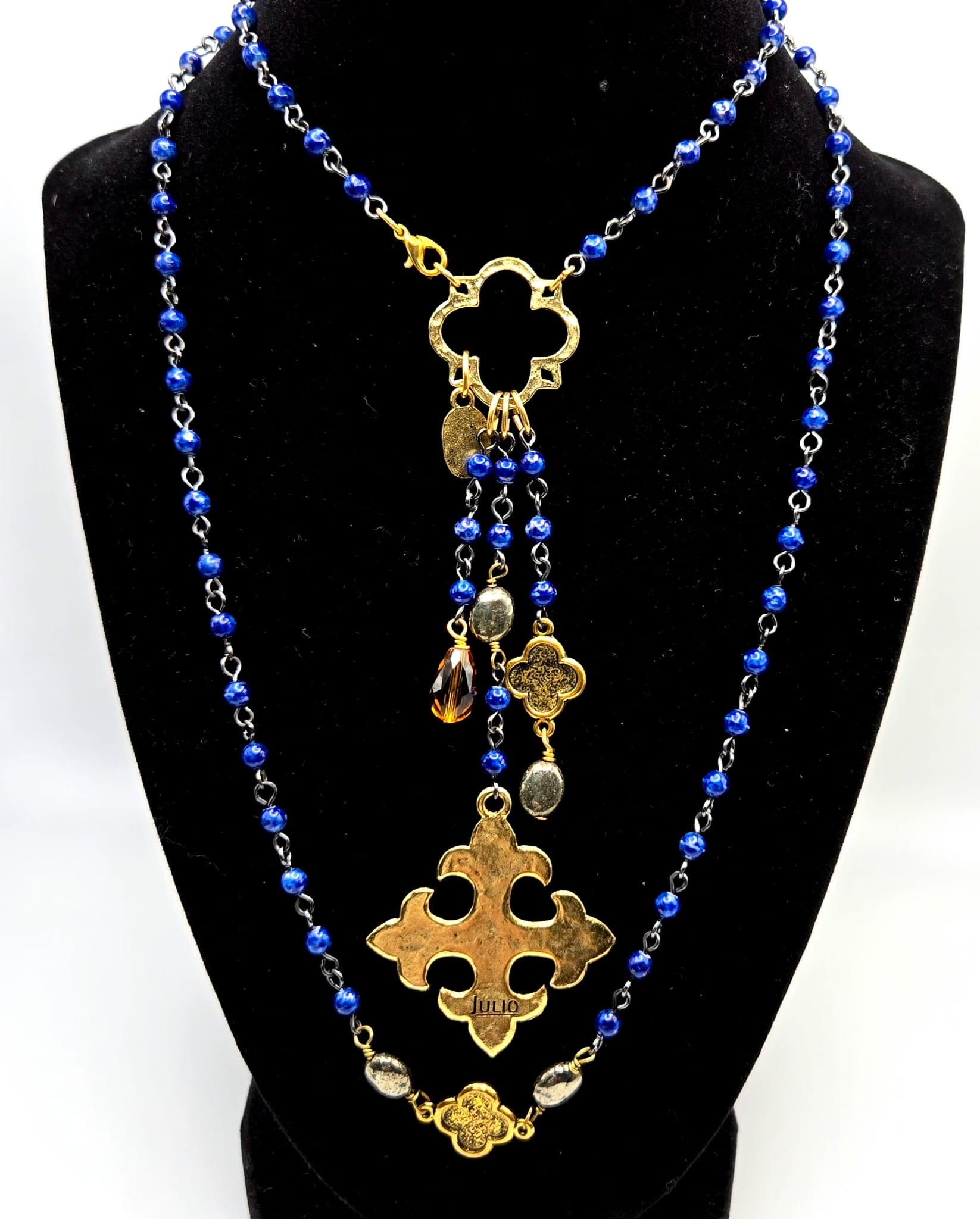 Beautiful Vintage JULIO DESIGN Faux lapis lazuli beads Cross gold tone necklace