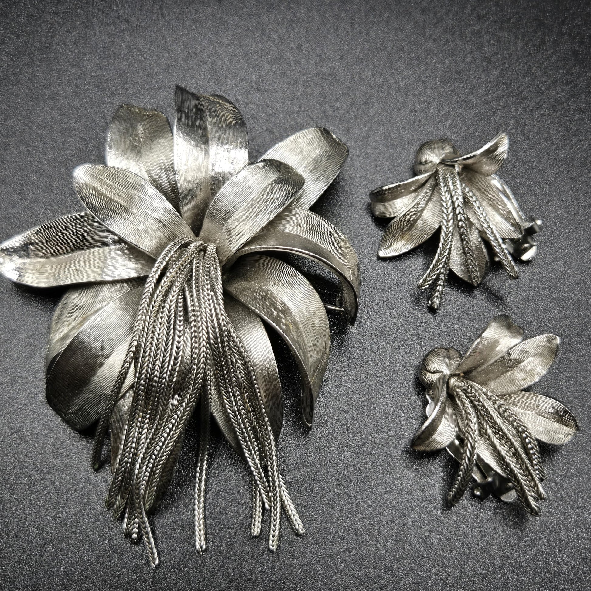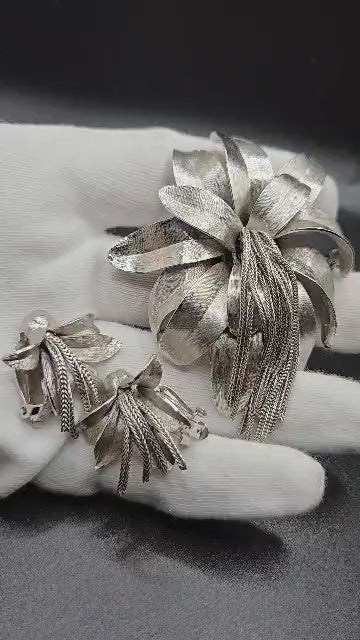 Vintage KRAMER signed flower tassel Brushed Silver tone Brooch Pin and Clip on Earrings set