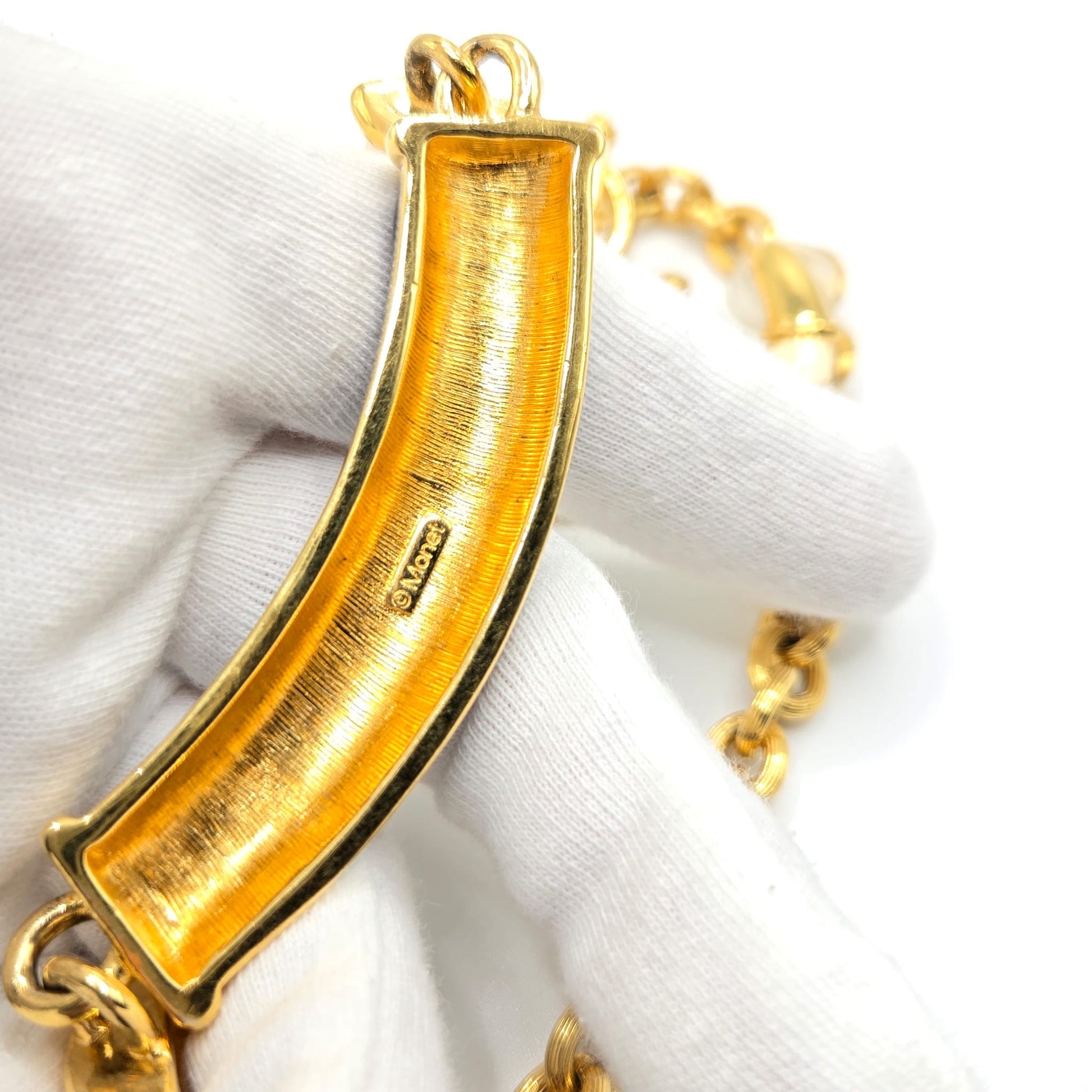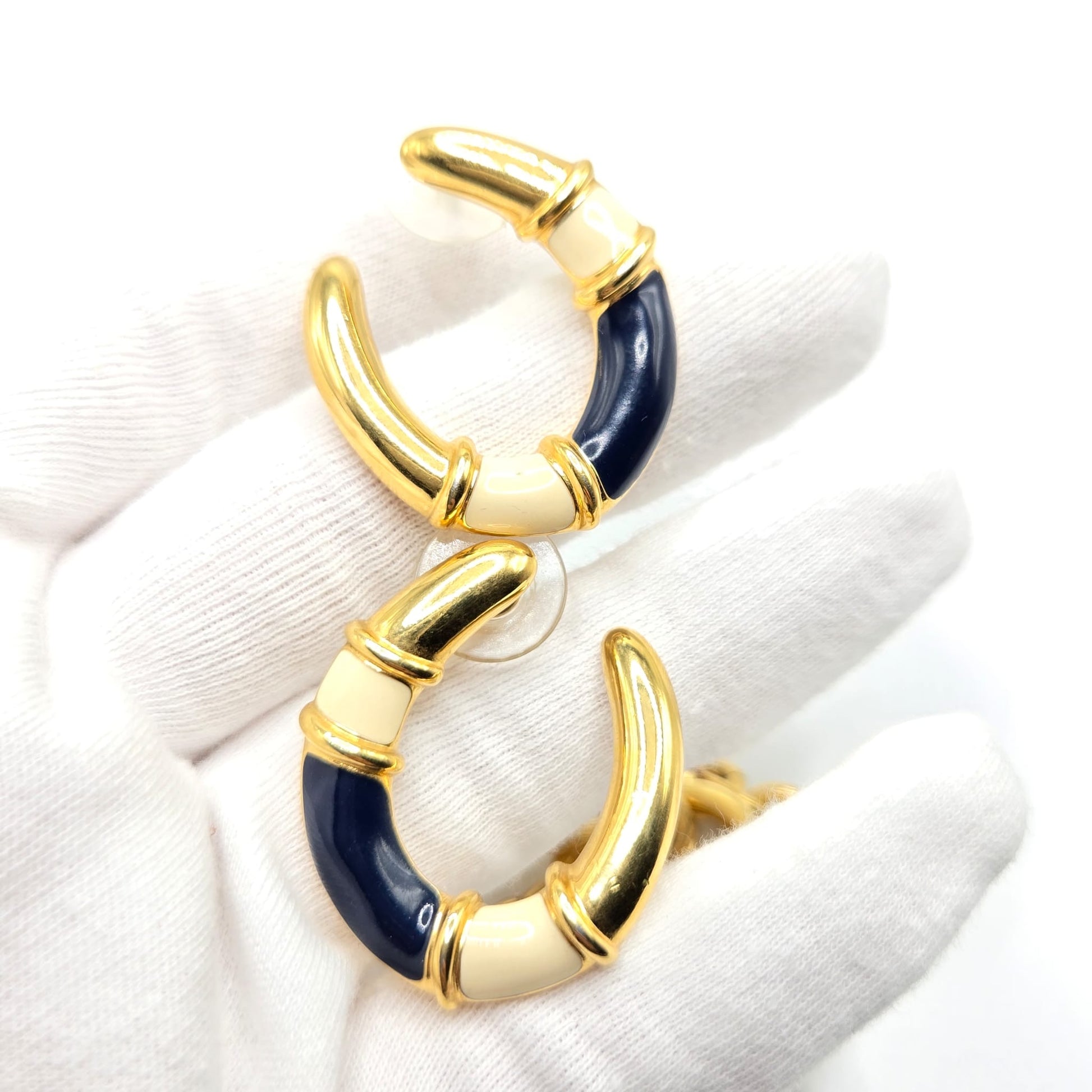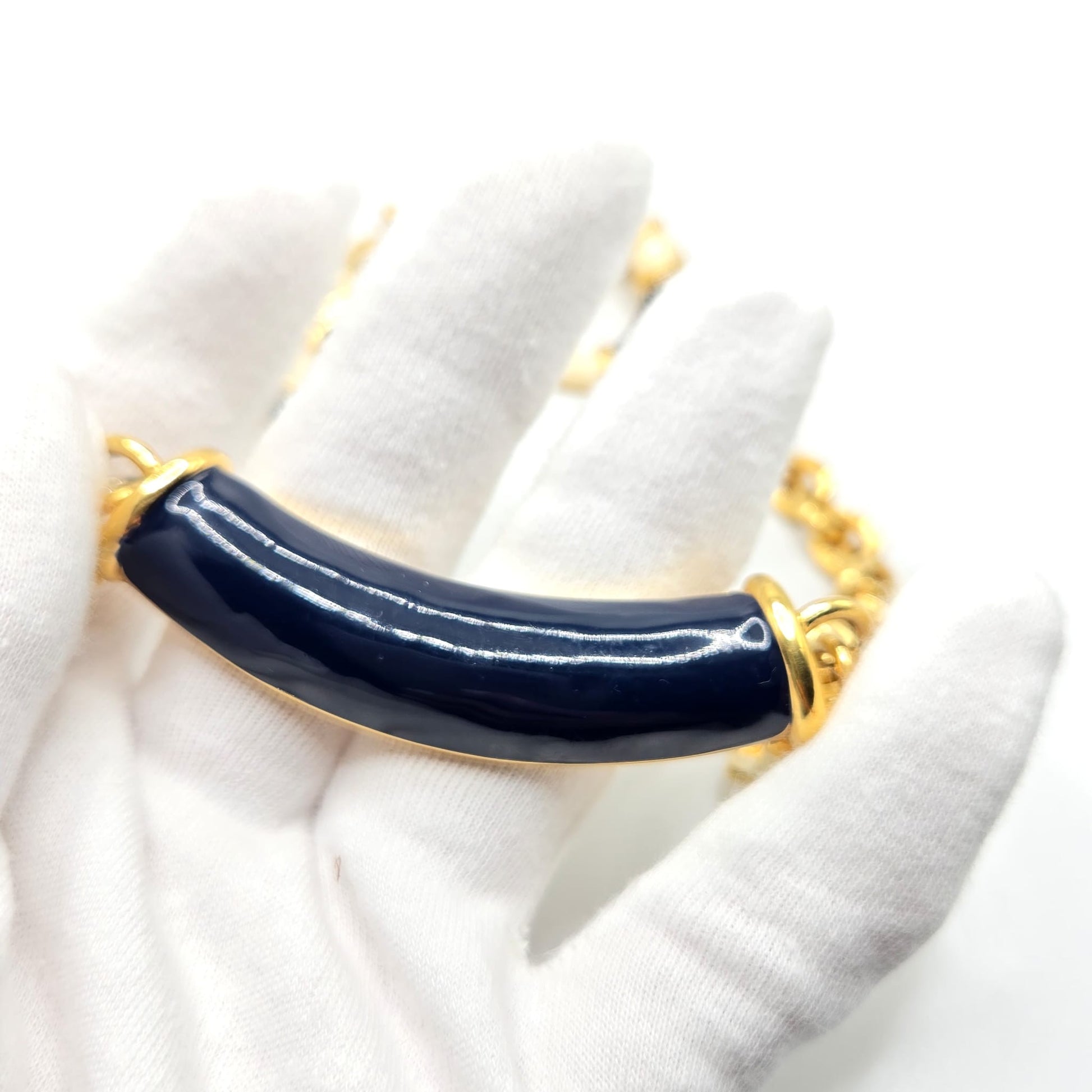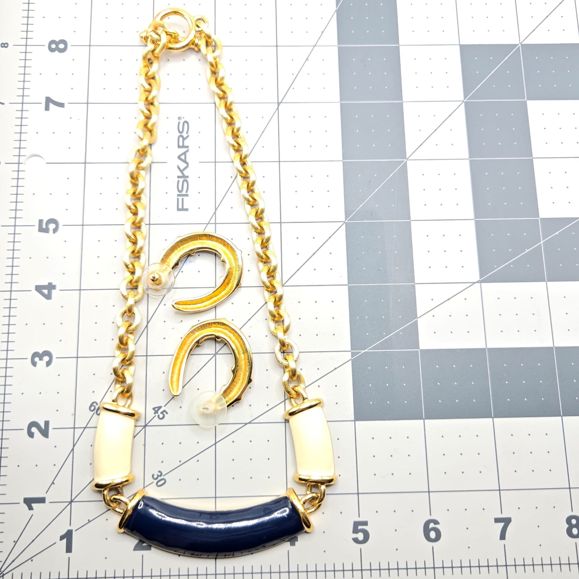 Vintage MONET navy blue and cream enamel gold tone chain necklace and earrings set designer runway