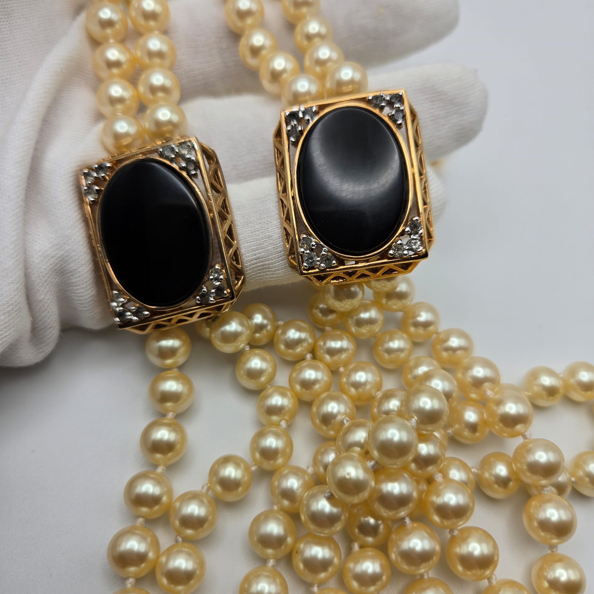Stunning Very Rare Vintage PANETTA Signed Black Glass Cabochon Rhinestones Gold Tone Long Faux Pearls Necklace Runway Designer