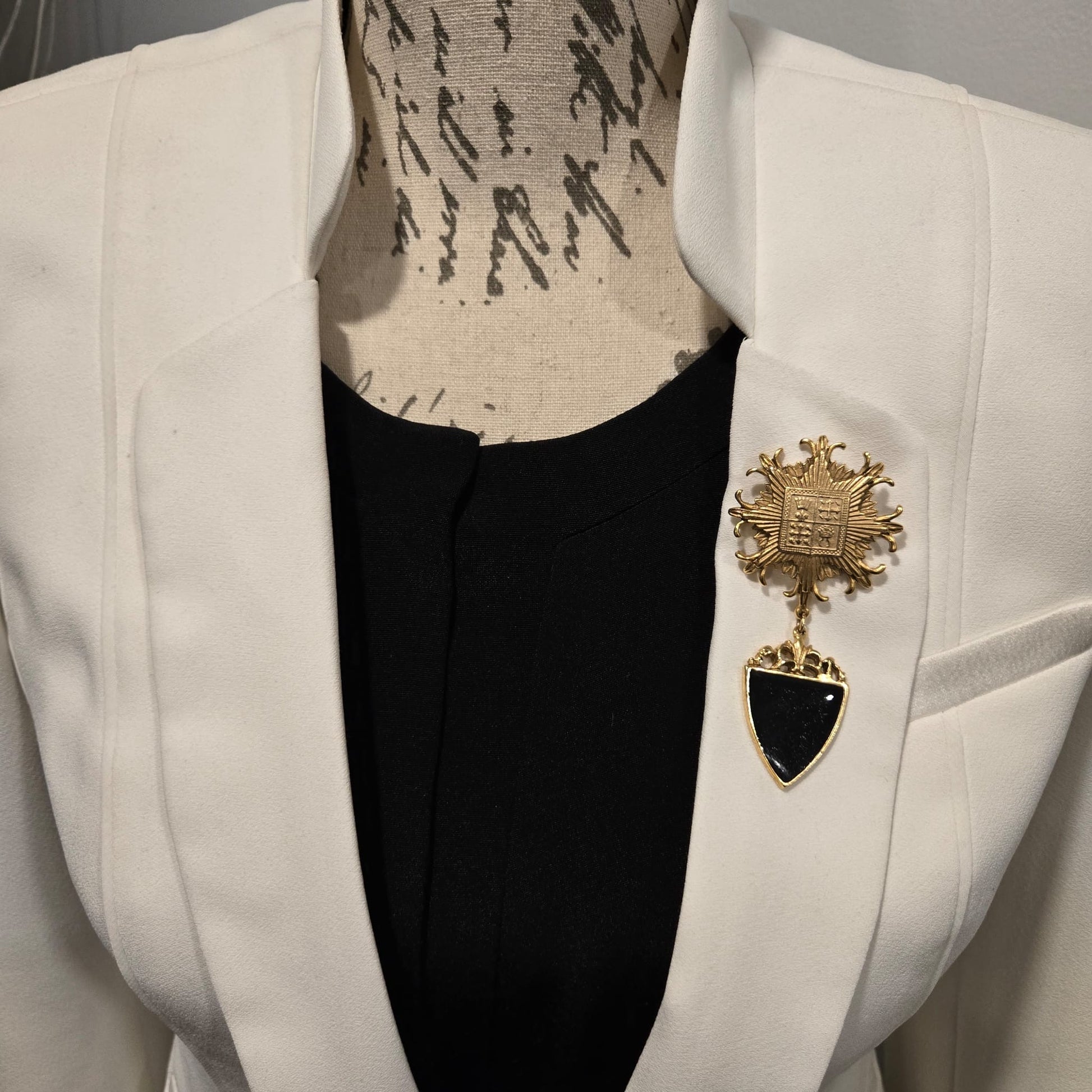 Vintage Symbol Crest Dangle Shield black Enamel gold tone Brooch
