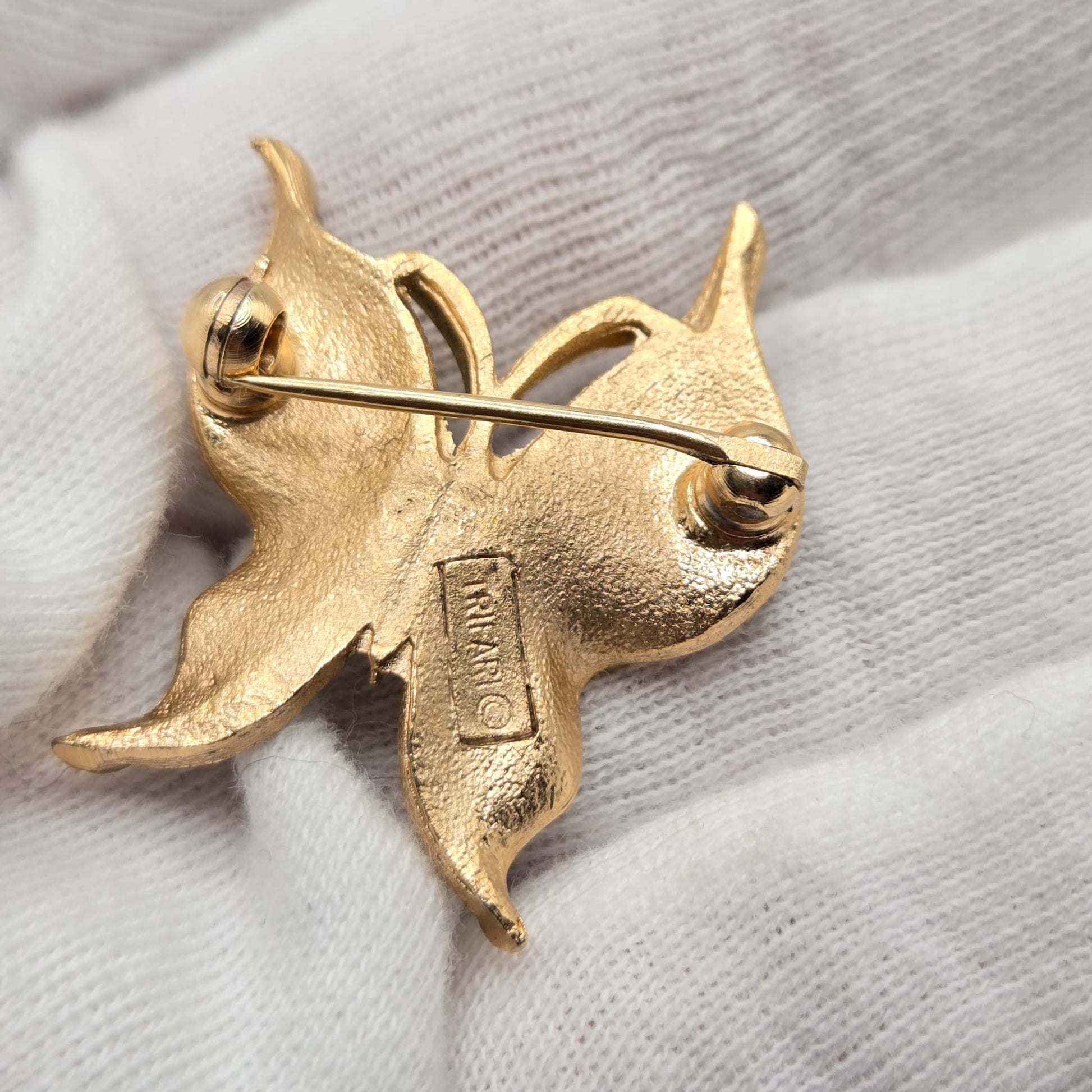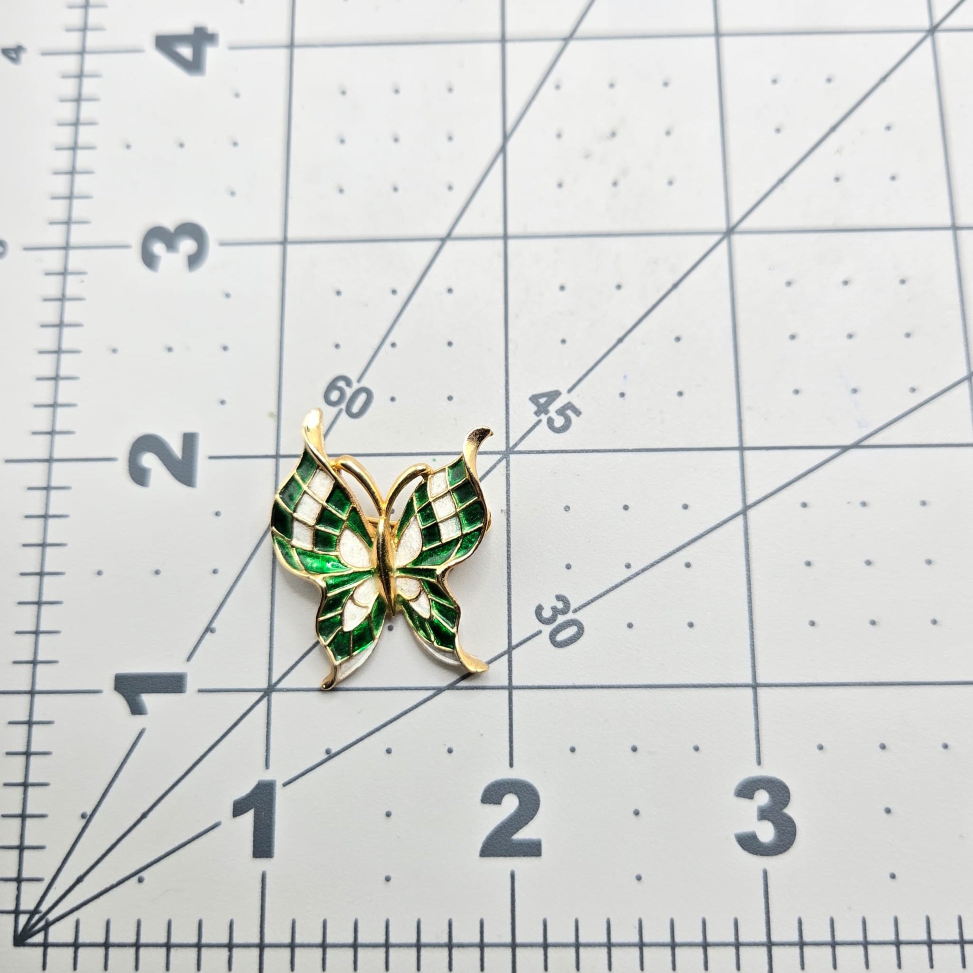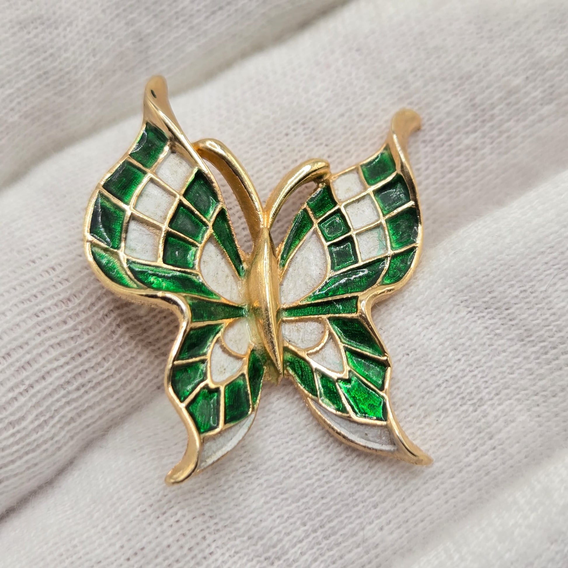 Vintage TRIFARI CROWN signed Butterfly green white enamel gold tone Brooch pin