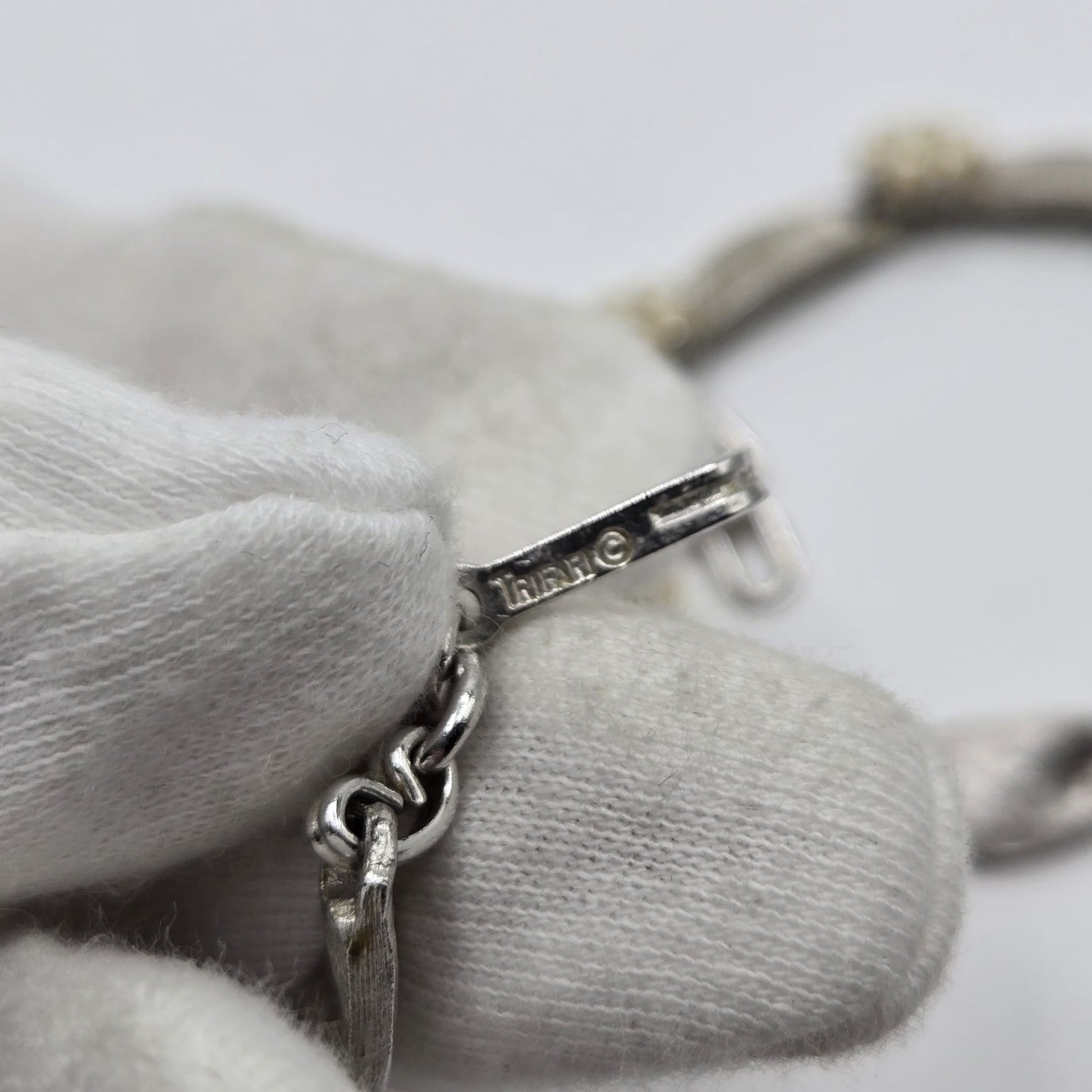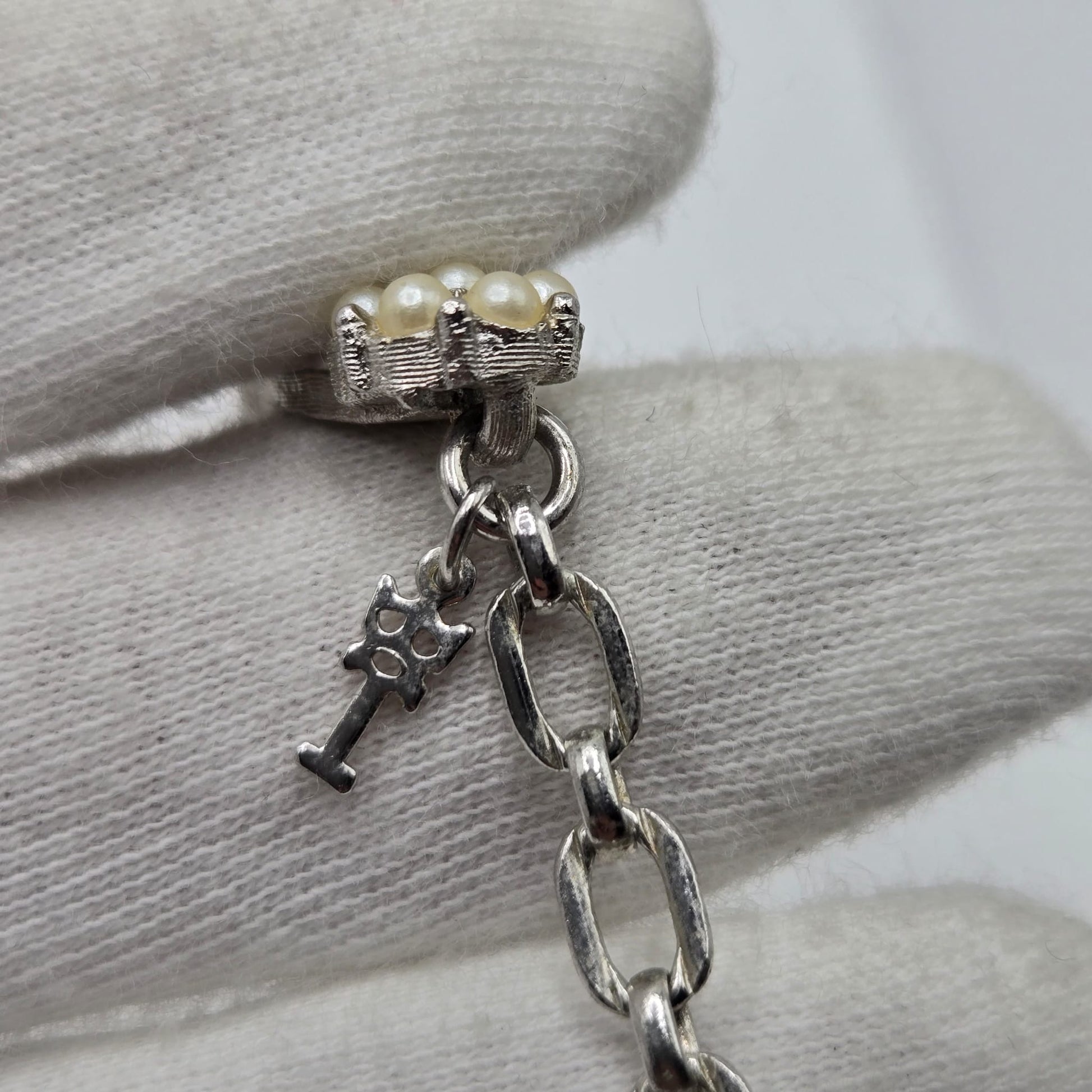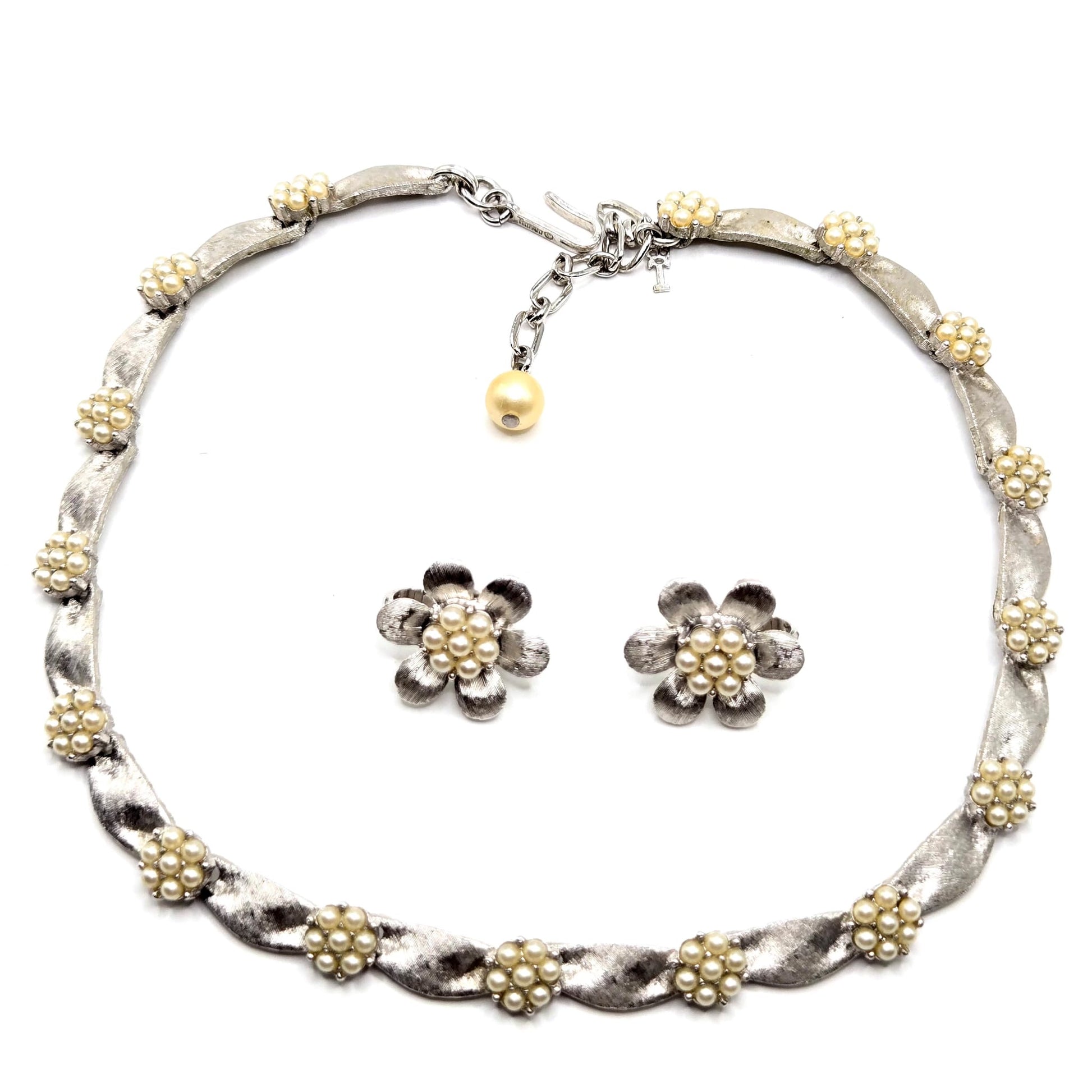Vintage TRIFARI CROWN signed Ribbon Faux Pearls Brushed Silver tone Necklace and flower clip on earrings set