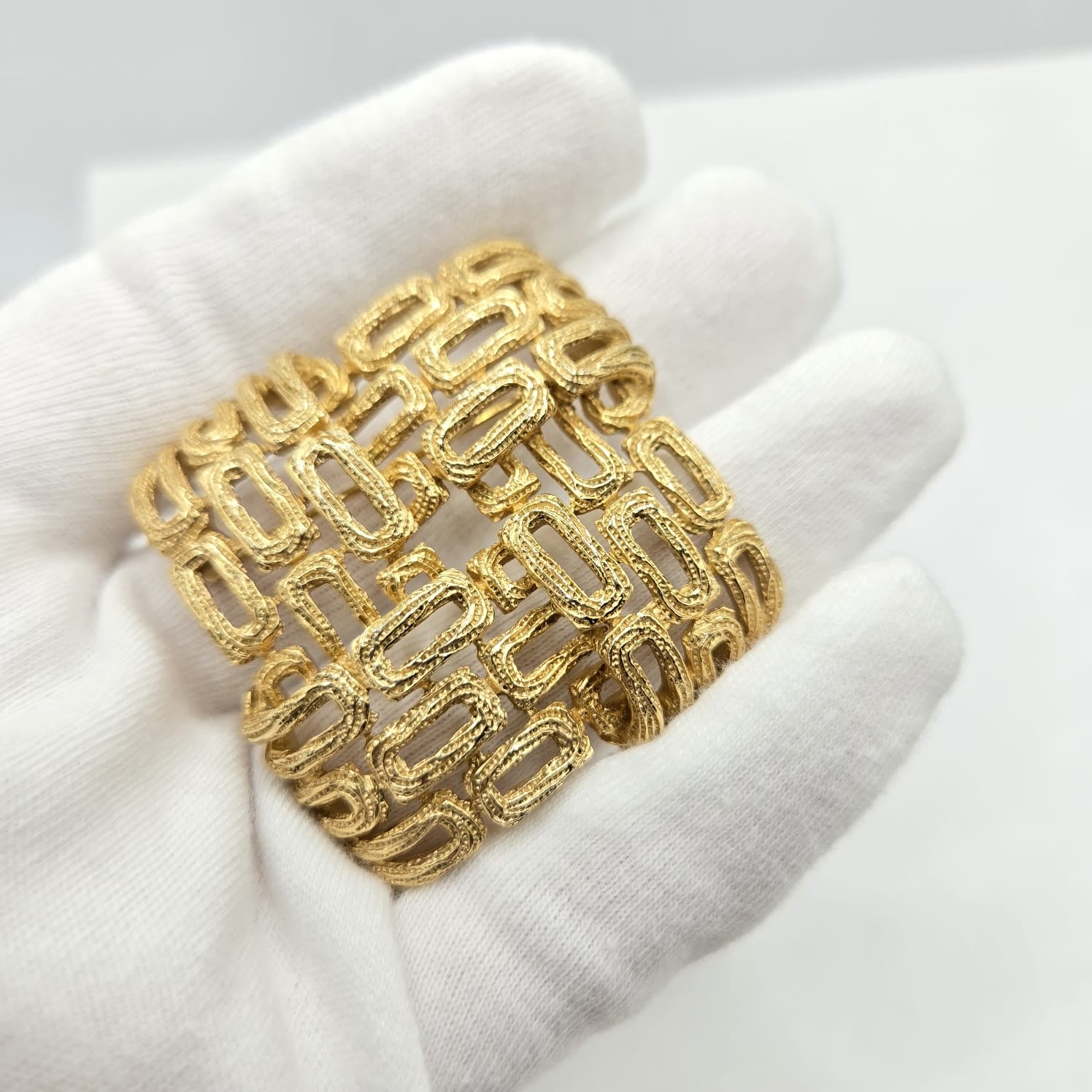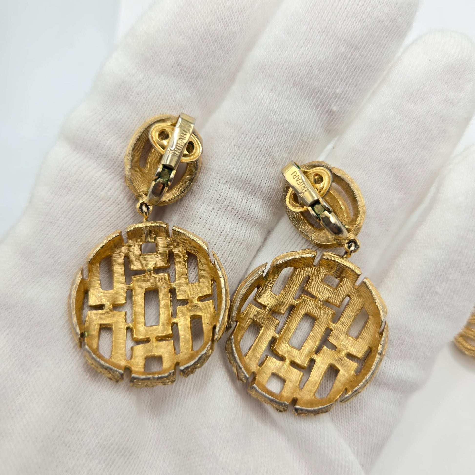 Vintage TRIFARI crown signed woven, open work gold tone brooch pin and dangle clip on earrings set