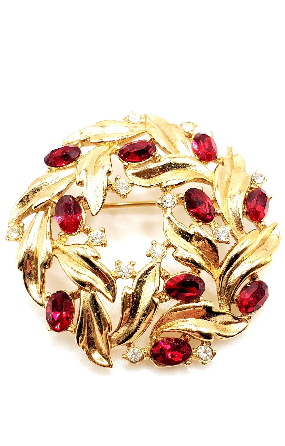 Vintage TRIFARI CROWN Signed Wreath Ruby Red and Clear Rhinestones Brooch Pin