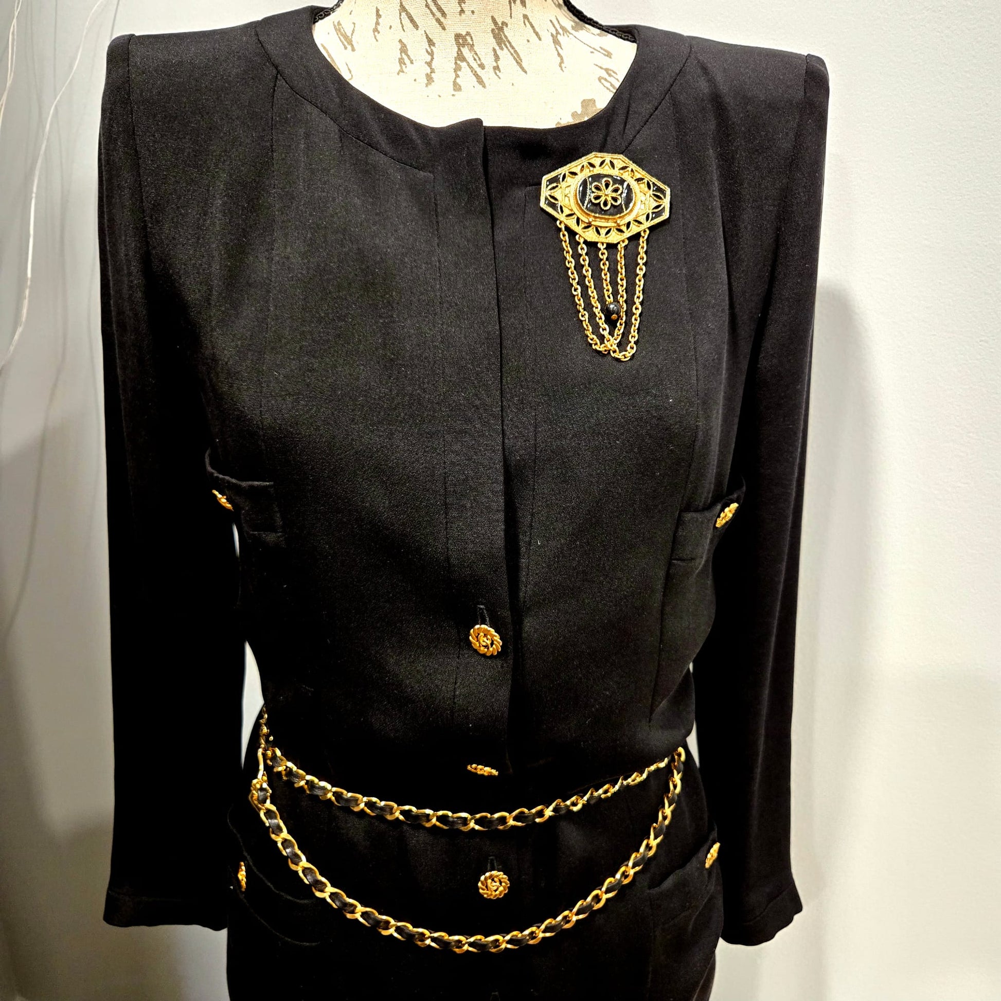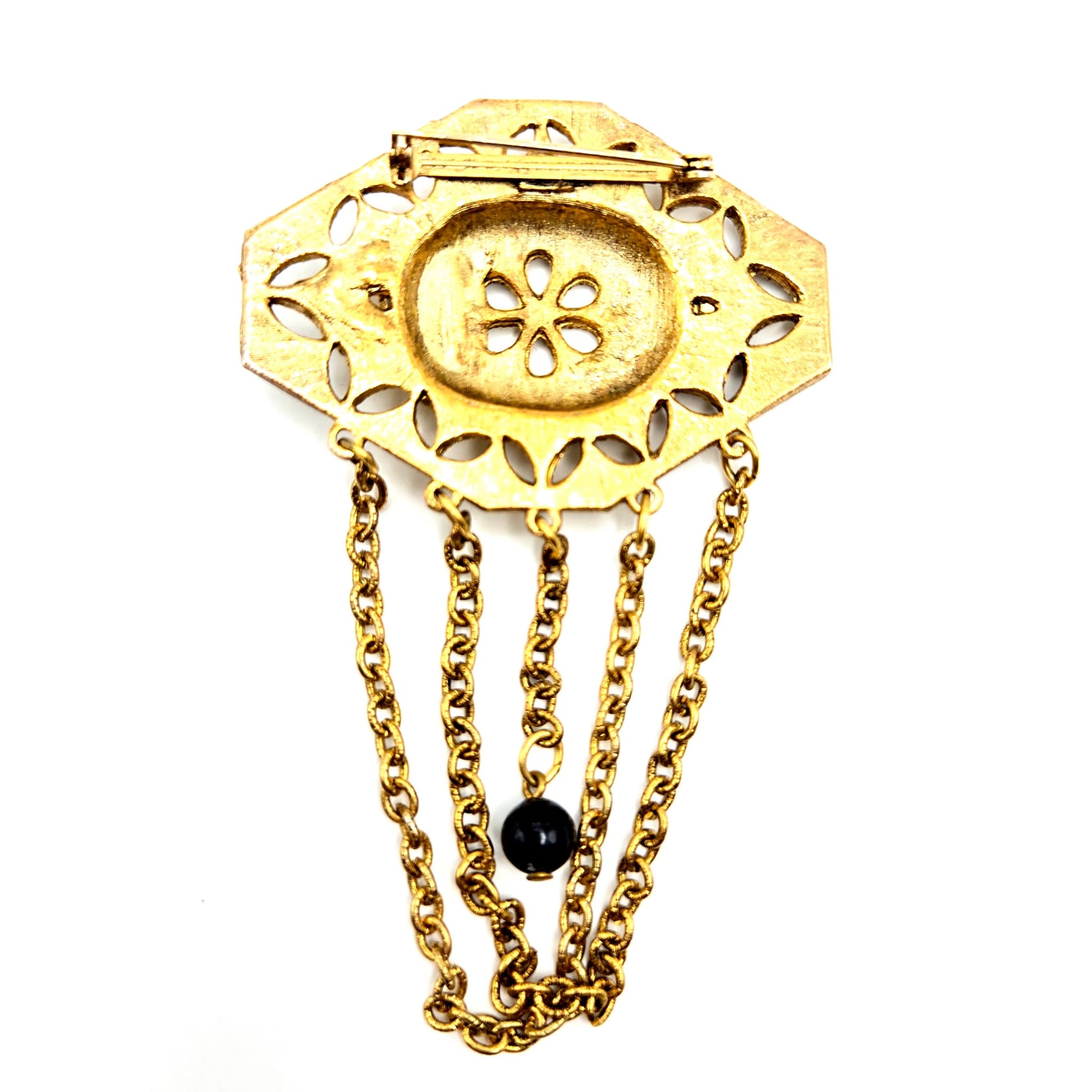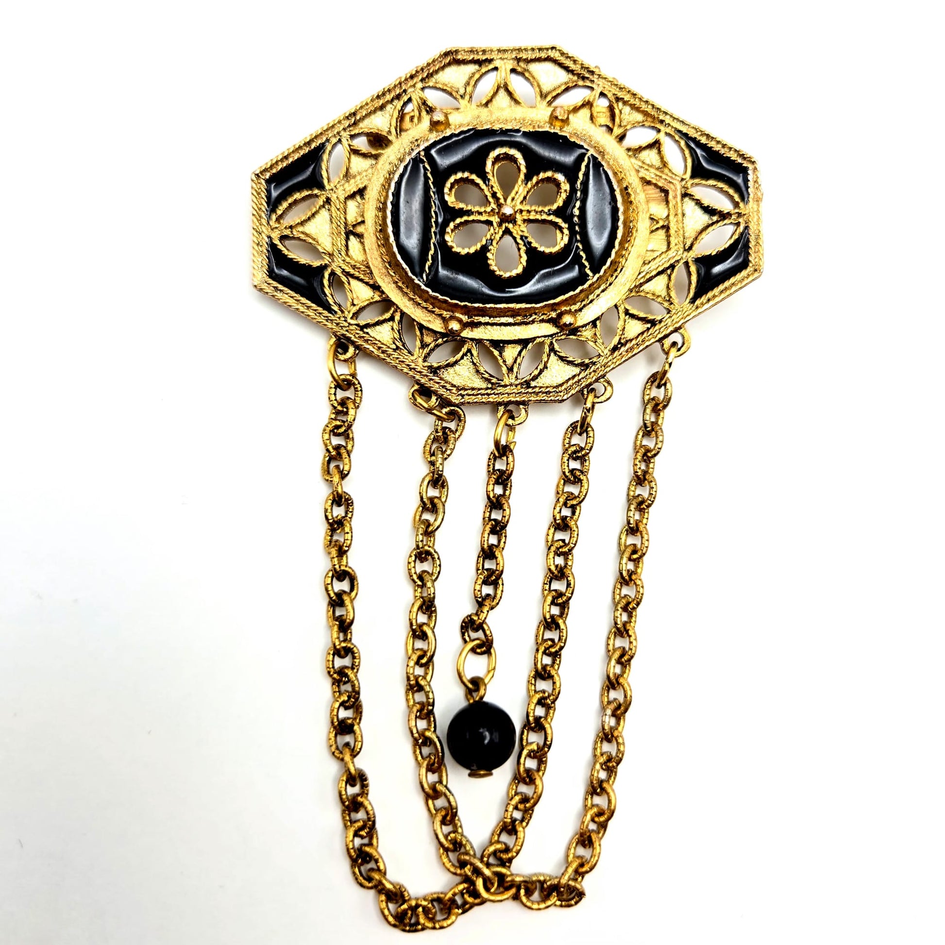 Vintage Victorian Revival Gold Tone, Black Enamel Dangling Chains Brooch Pin